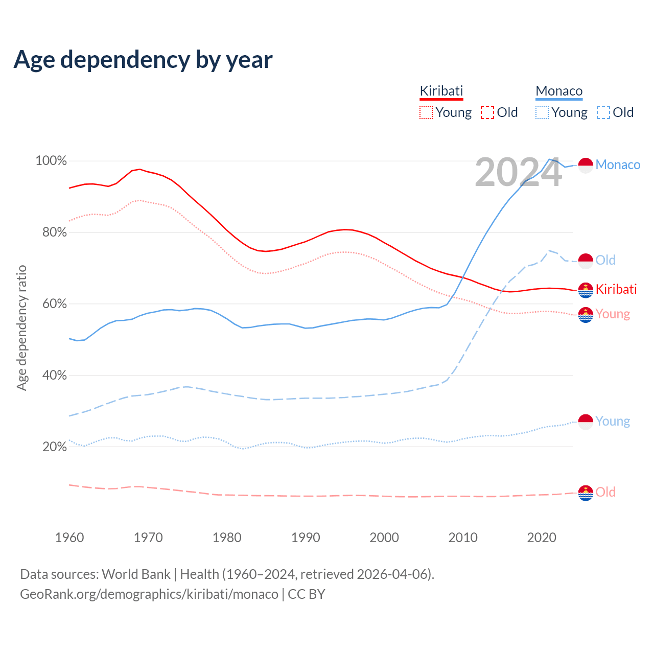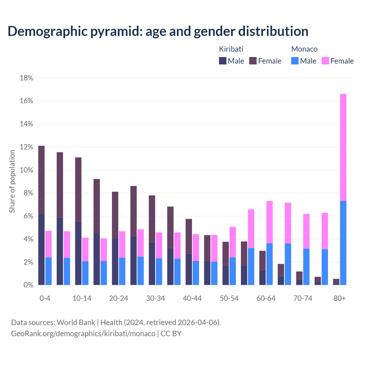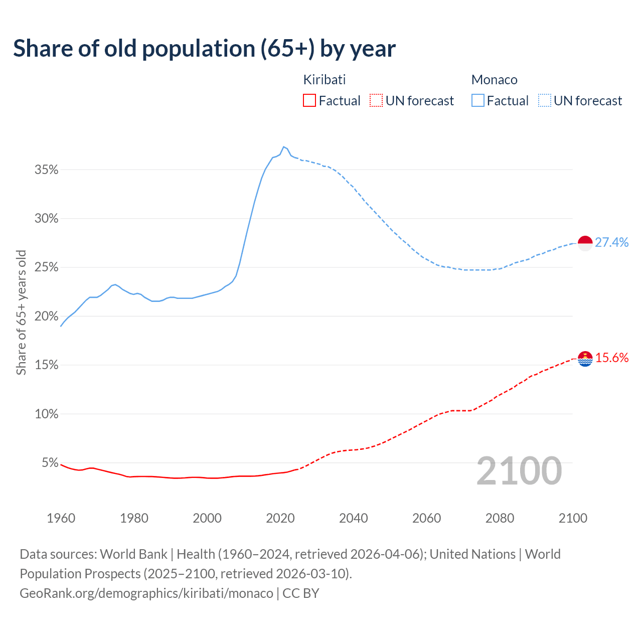 The share of older people aged 65 and over is 4.24% in Kiribati and 36.2% in Monaco. Life expectancy in Kiribati compared to Monaco .