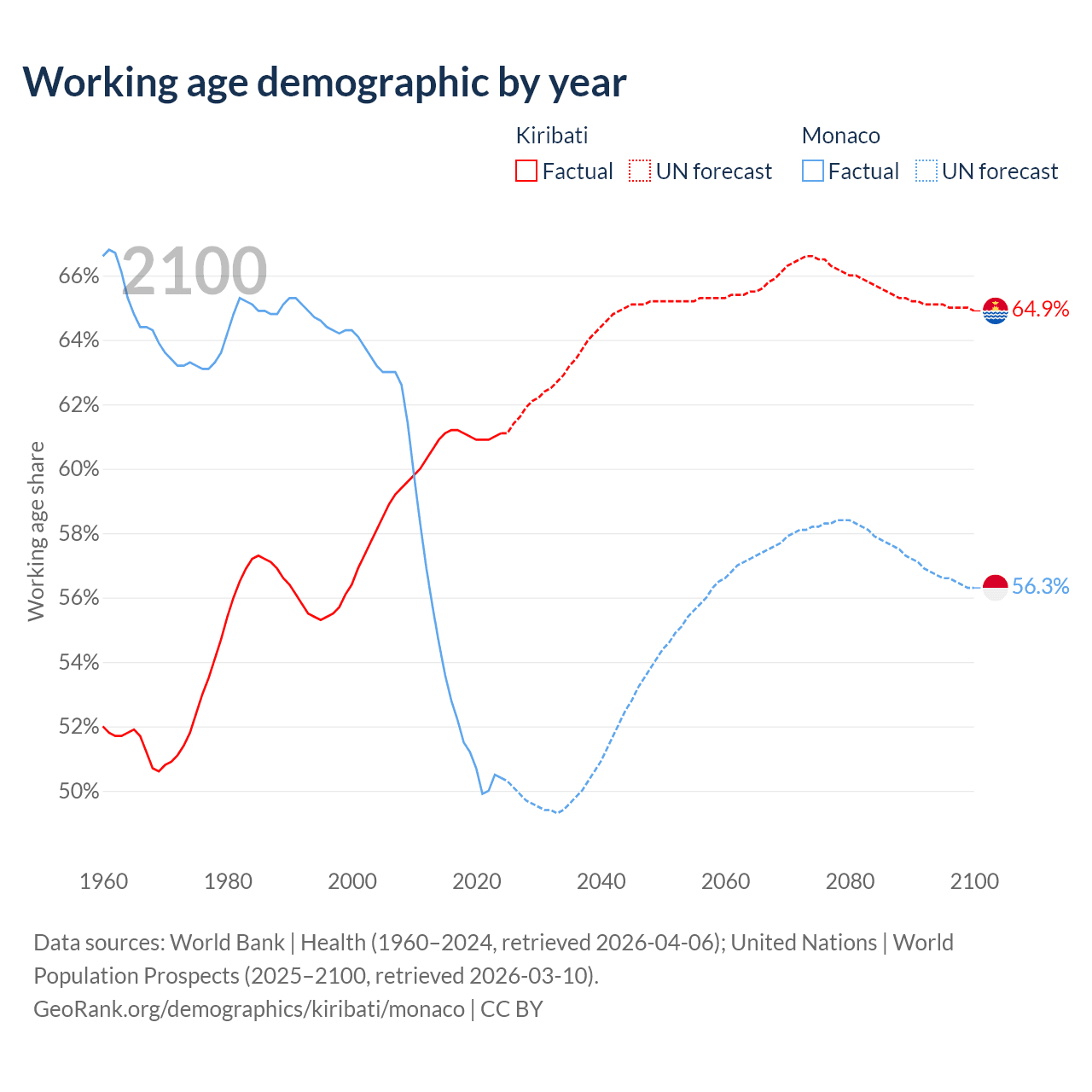 - Kiribati has 84.9K working age adults (aged 15-64) vs 19.2K in Monaco.