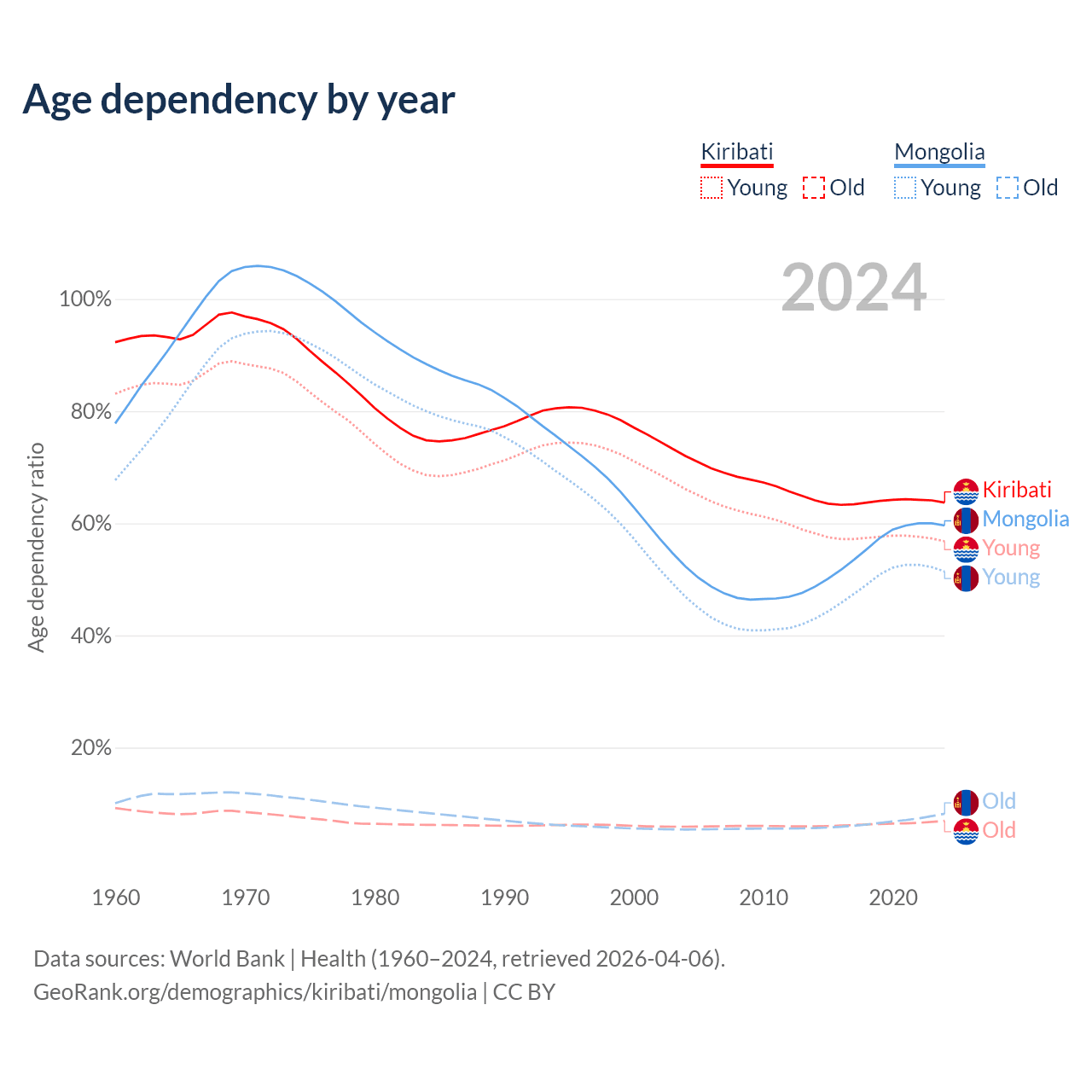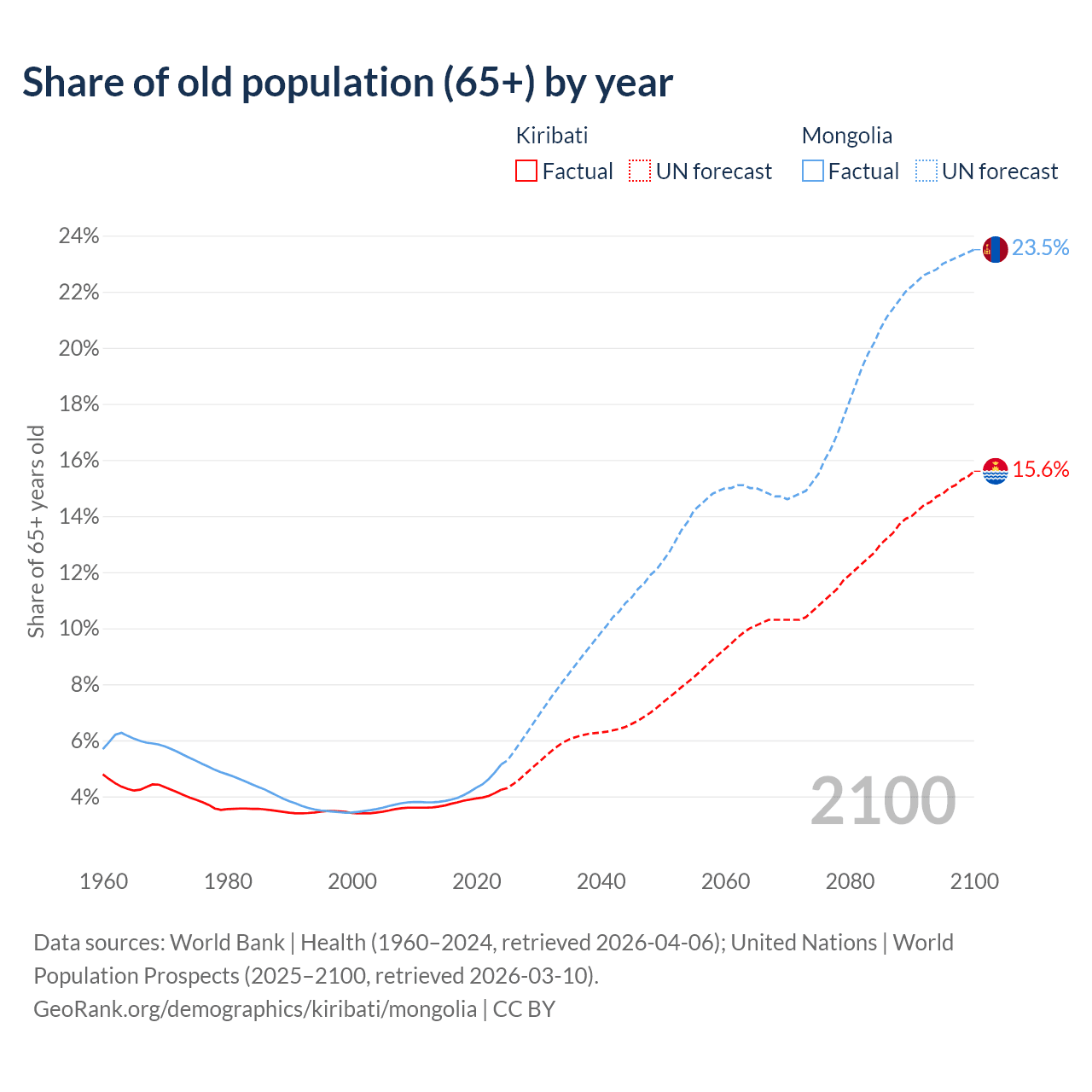 - The share of old-age demographic (65+) in Kiribati is 4.24% vs 5.14% in Mongolia.