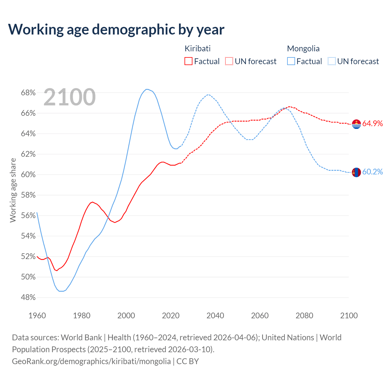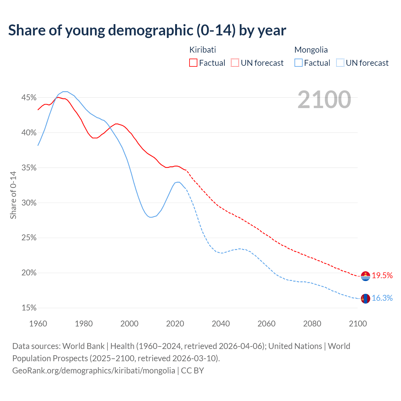 - The share of young demographic (0-15 years old) in Kiribati is 34.7% vs 32.2% in Mongolia.