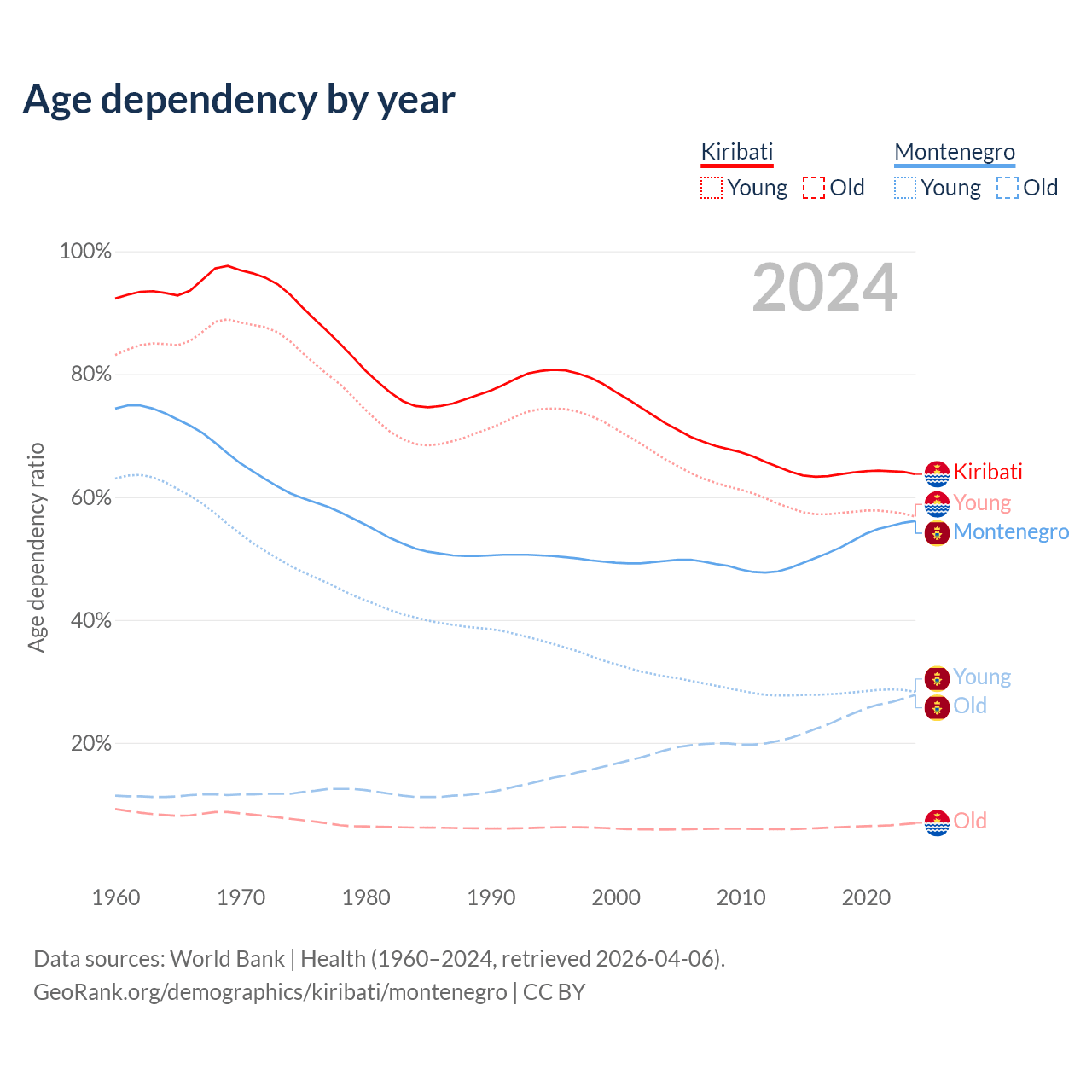 - The share of old-age demographic (65+) in Kiribati is 4.24% vs 17.8% in Montenegro.