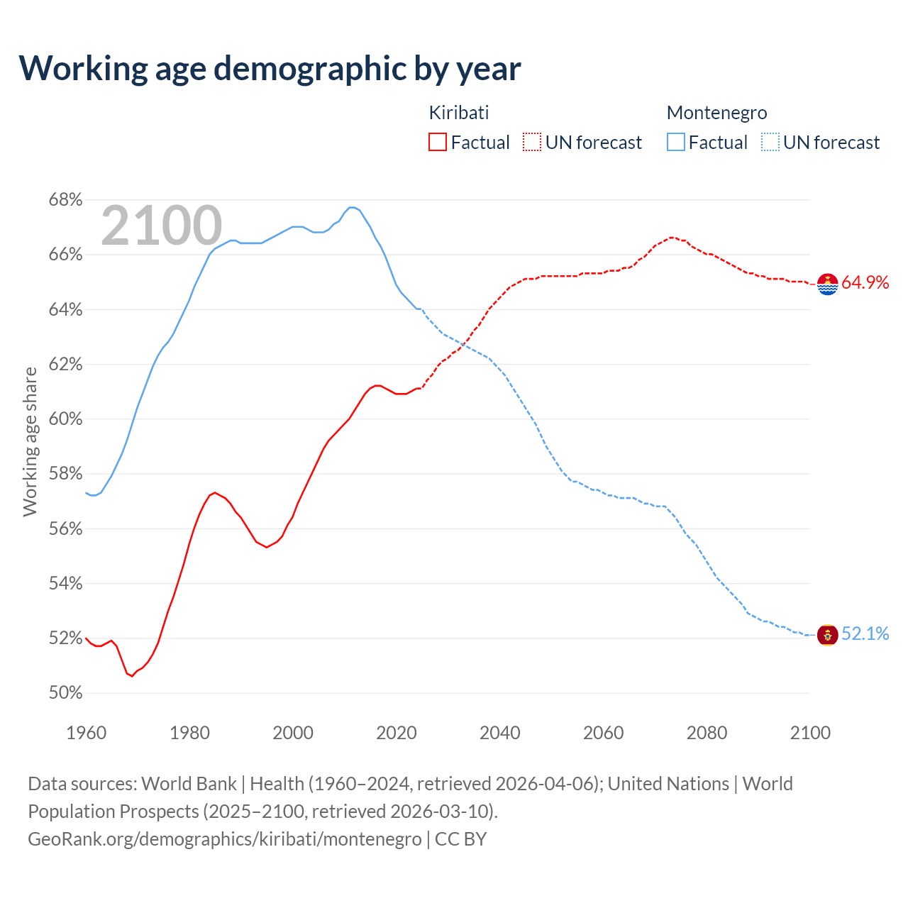 Median age Kiribati vs Montenegro, 1960-2100