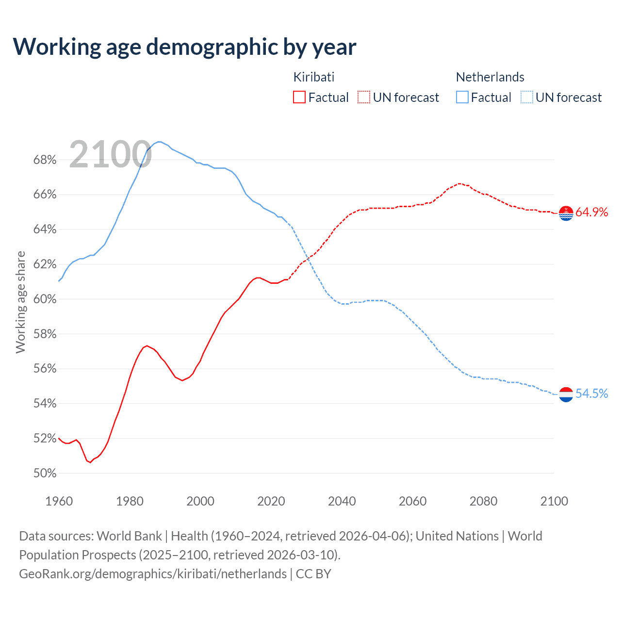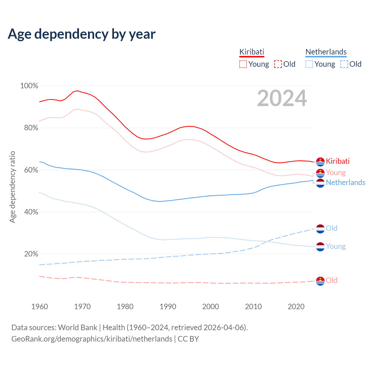 - The share of old-age demographic (65+) in Kiribati is 4.24% vs 20.5% in the Netherlands.