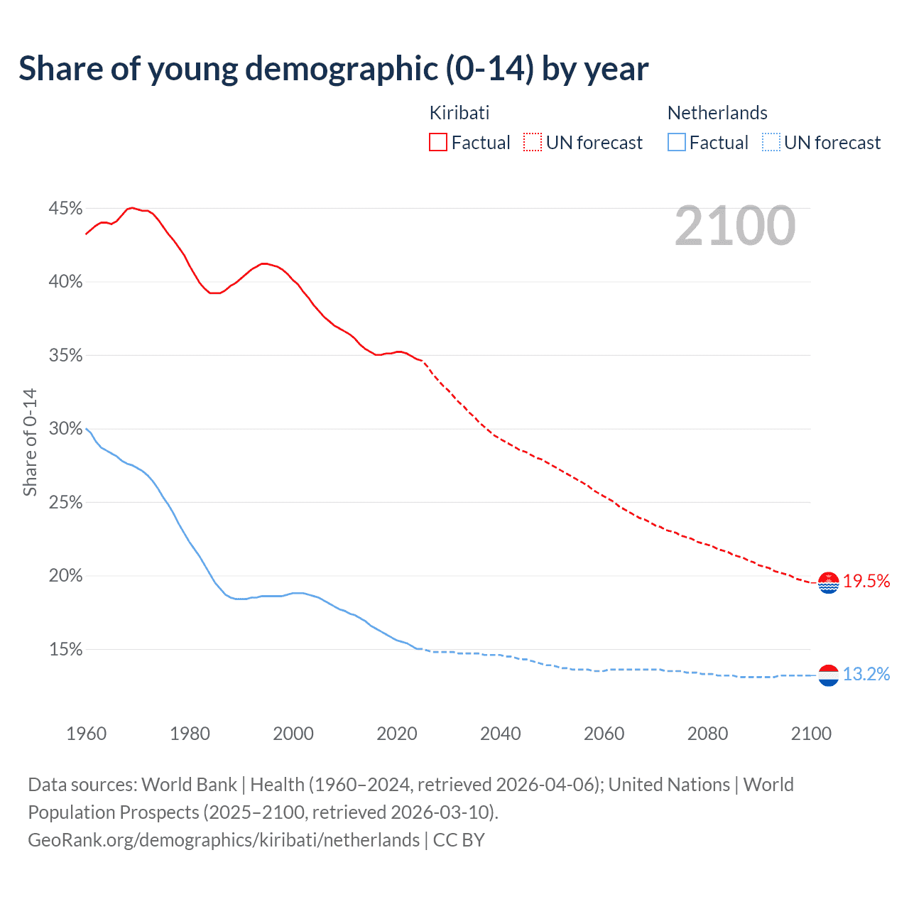 - The share of young demographic (0-15 years old) in Kiribati is 34.7% vs 15% in the Netherlands.