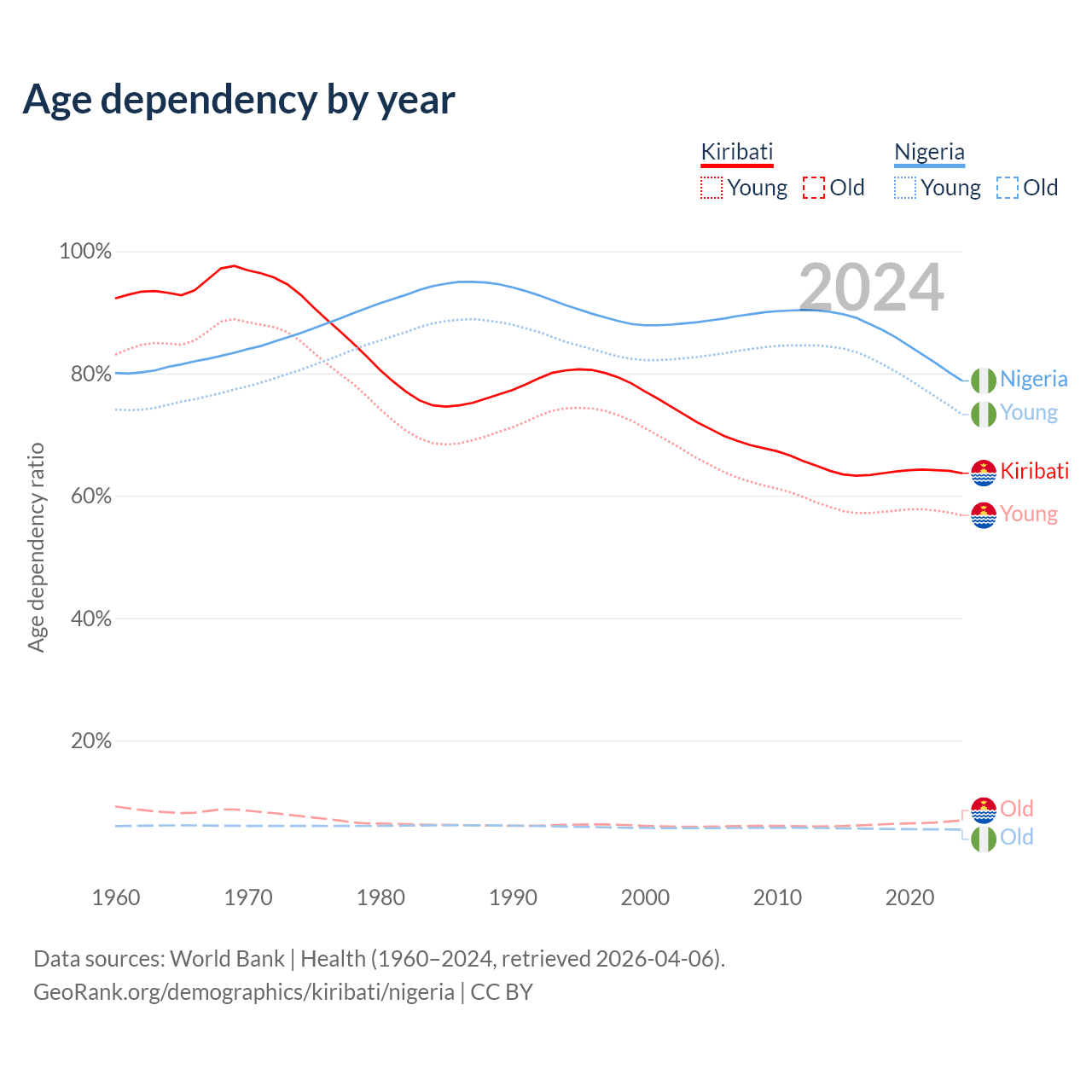 - The share of old-age demographic (65+) in Kiribati is 4.24% vs 3.05% in Nigeria.