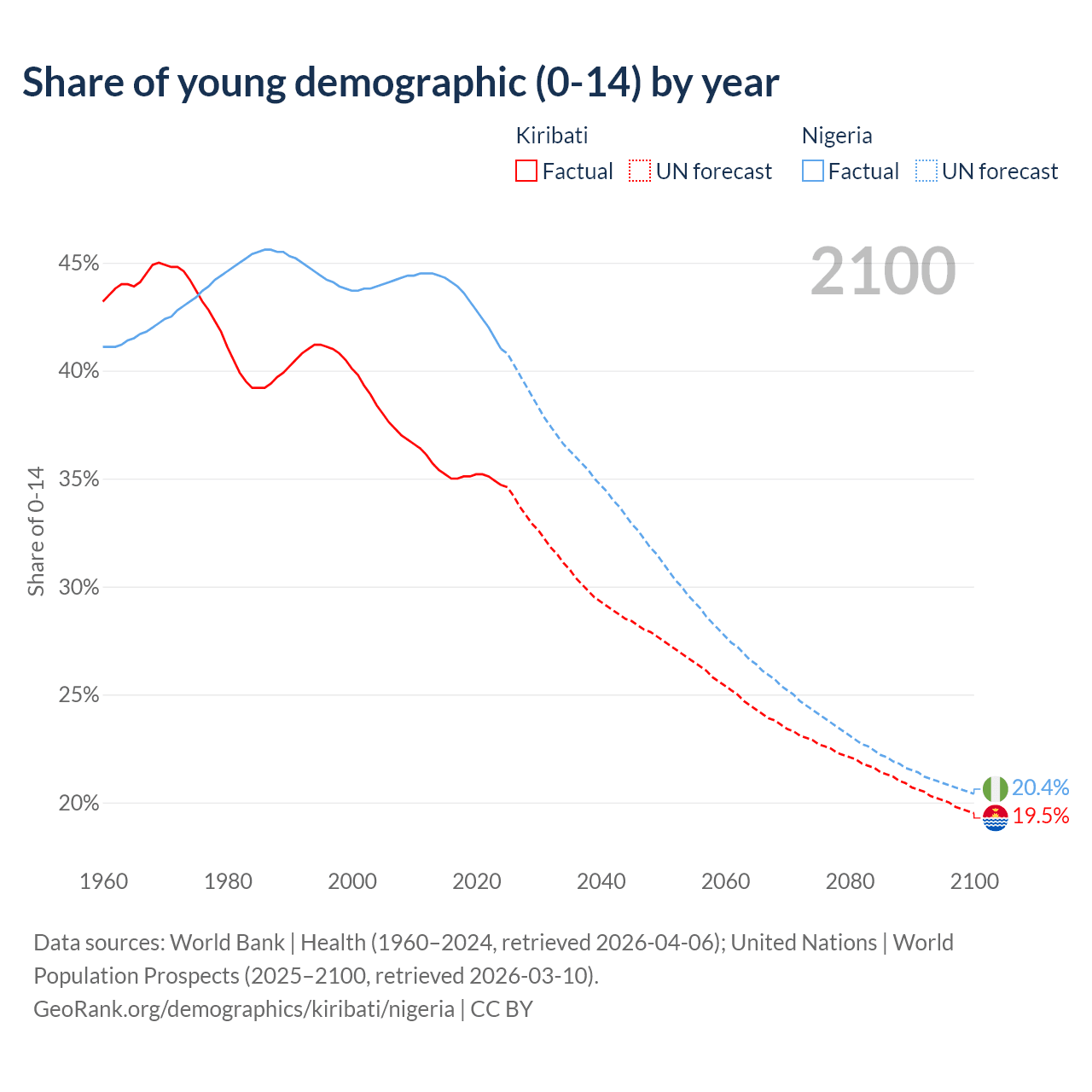 Median age Kiribati vs Nigeria, 1960-2100