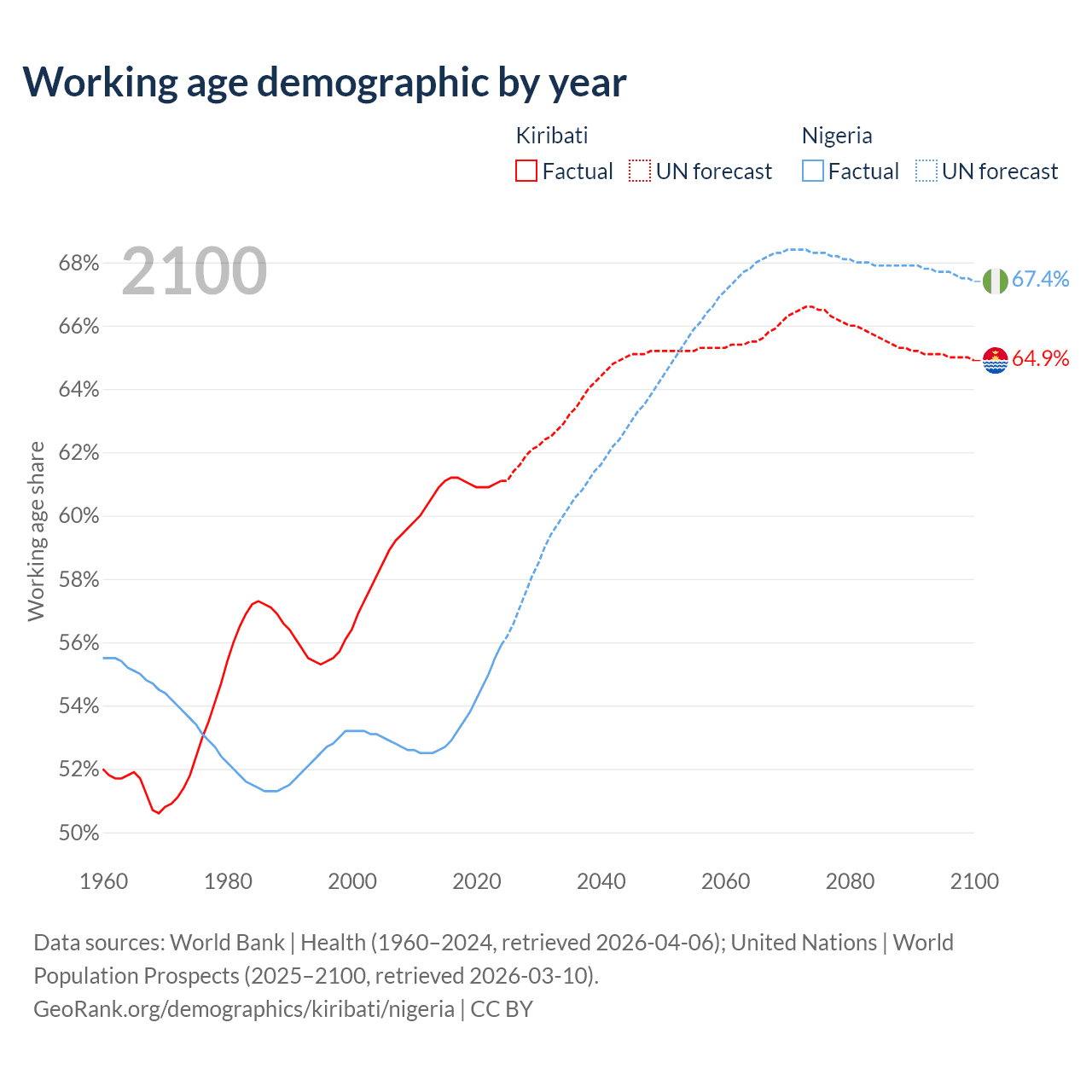 The share of older people aged 65 and over is 4.24% in Kiribati and 3.05% in Nigeria. Life expectancy in Kiribati compared to Nigeria .