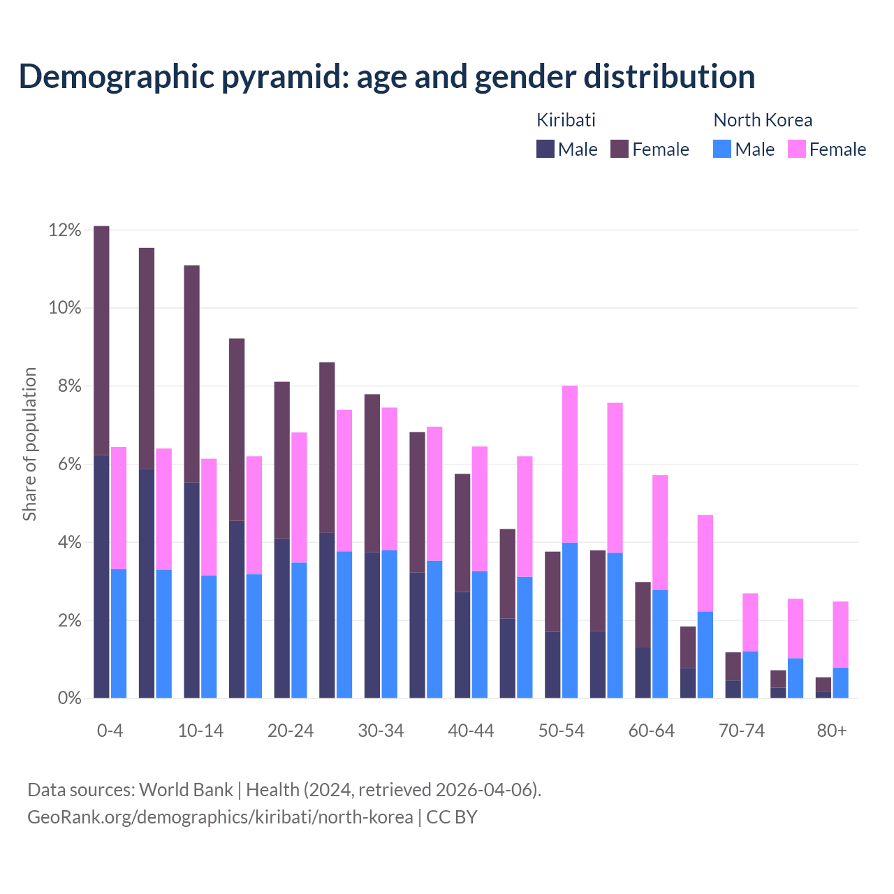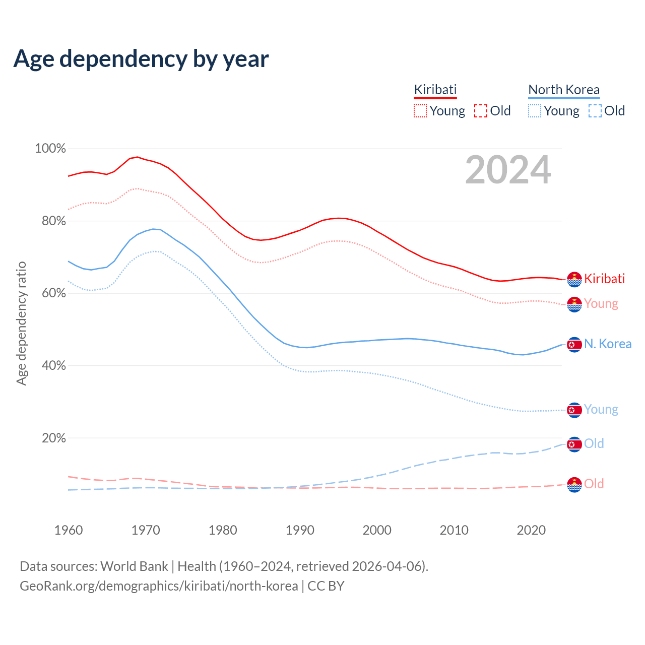 - The share of old-age demographic (65+) in Kiribati is 4.24% vs 12.4% in North Korea.