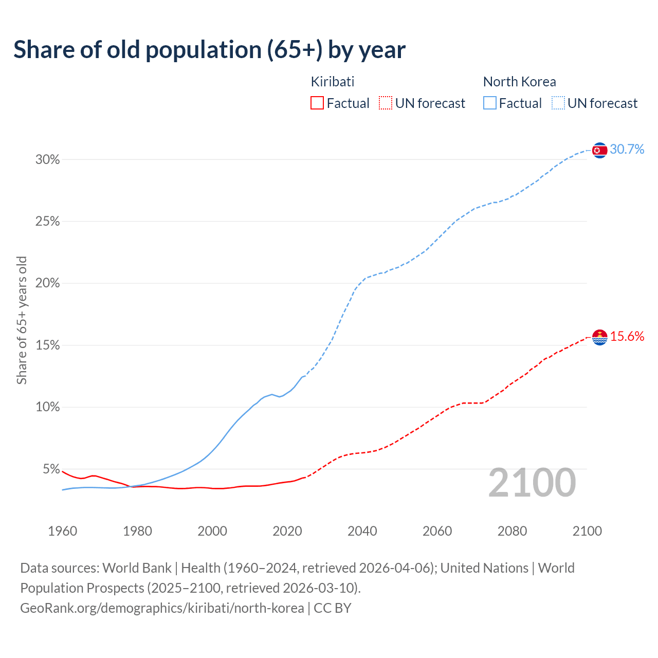The share of older people aged 65 and over is 4.24% in Kiribati and 12.4% in North Korea. Life expectancy in Kiribati compared to North Korea .