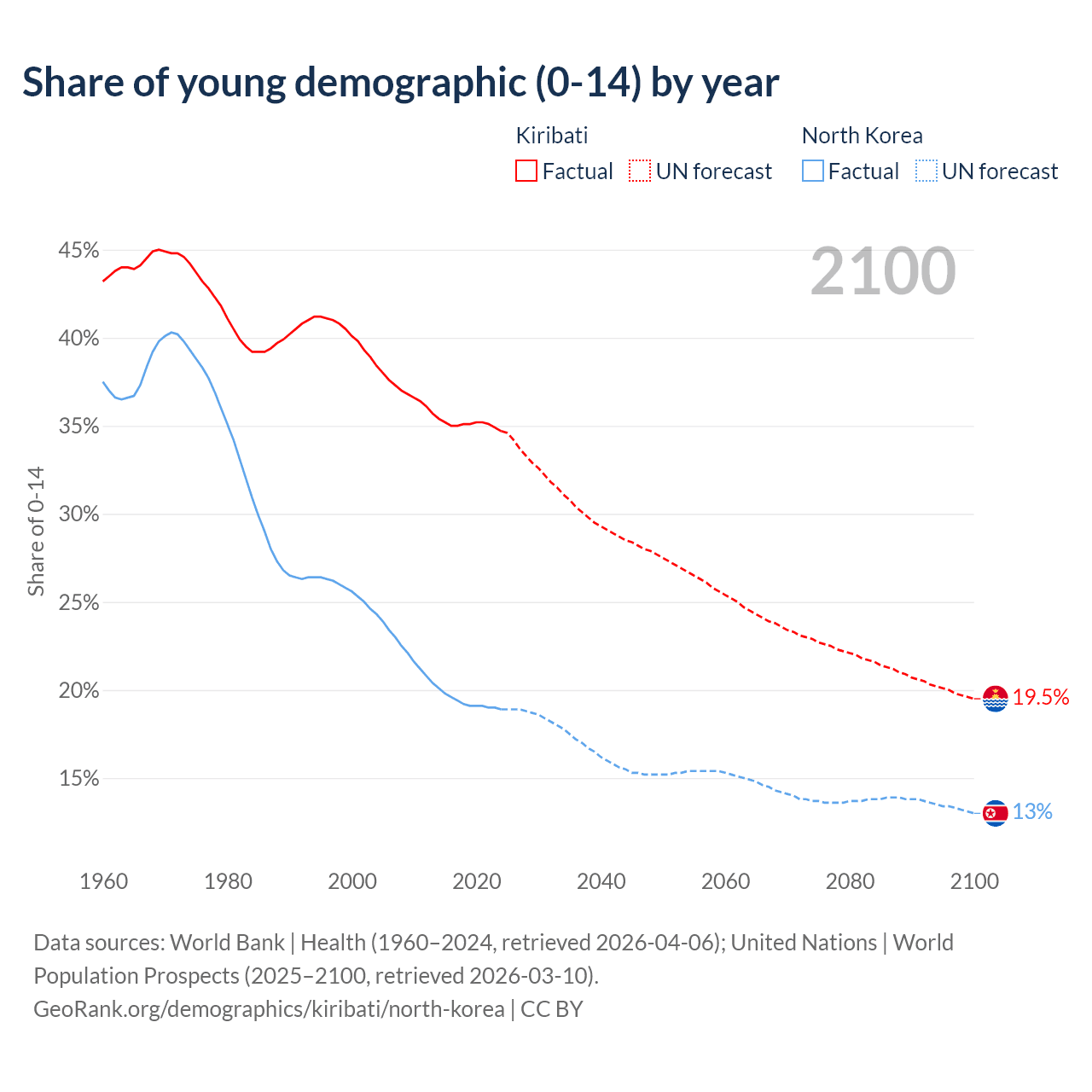 - The share of young demographic (0-15 years old) in Kiribati is 34.7% vs 18.9% in North Korea.