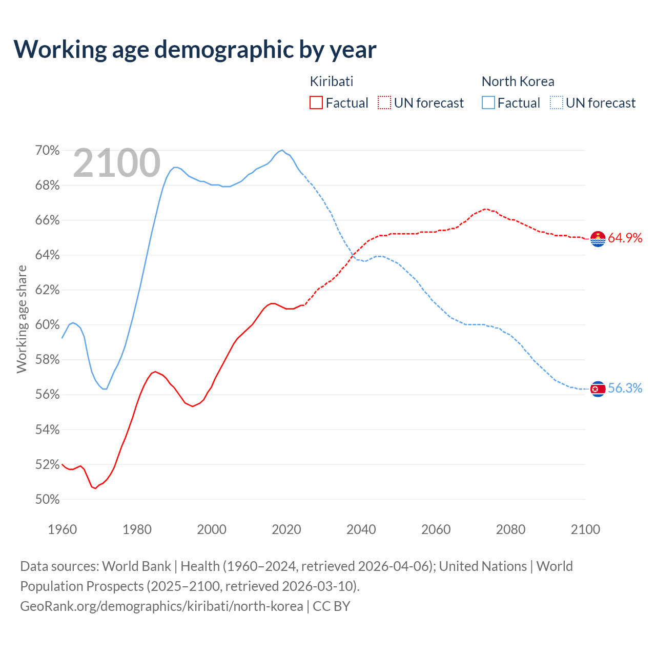 - Kiribati has 84.9K working age adults (aged 15-64) vs 18.3M in North Korea.