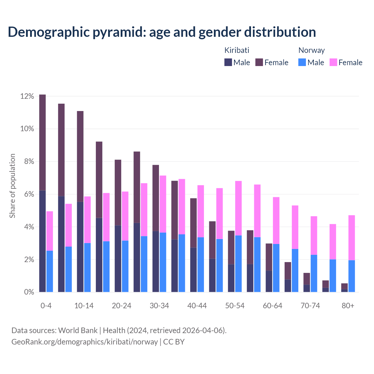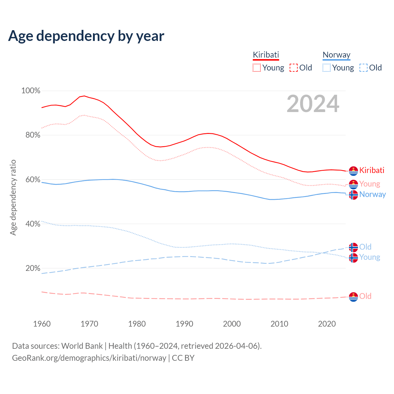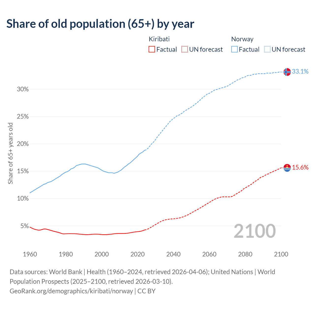 - The share of old-age demographic (65+) in Kiribati is 4.24% vs 18.8% in Norway.