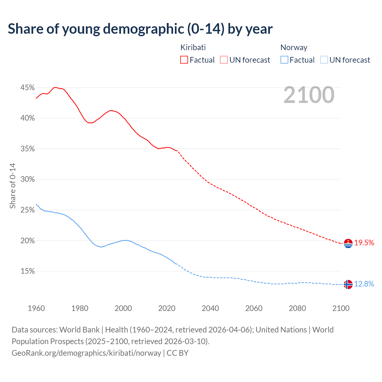 - The share of young demographic (0-15 years old) in Kiribati is 34.7% vs 16.2% in Norway.