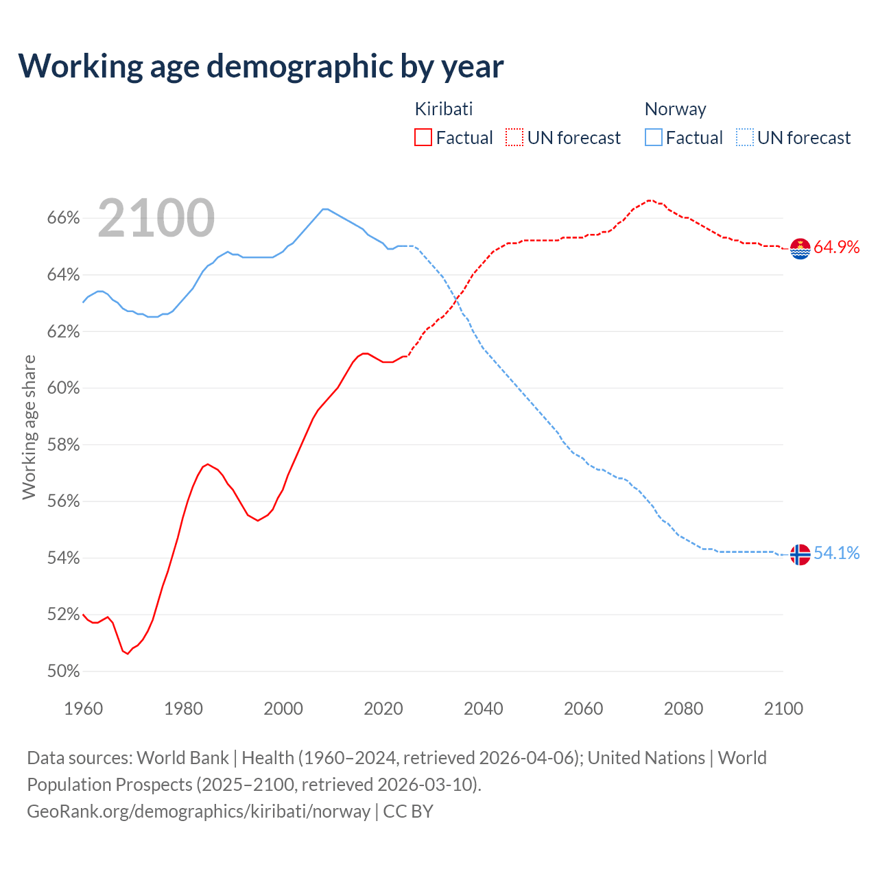 - Kiribati has 84.9K working age adults (aged 15-64) vs 3.69M in Norway.