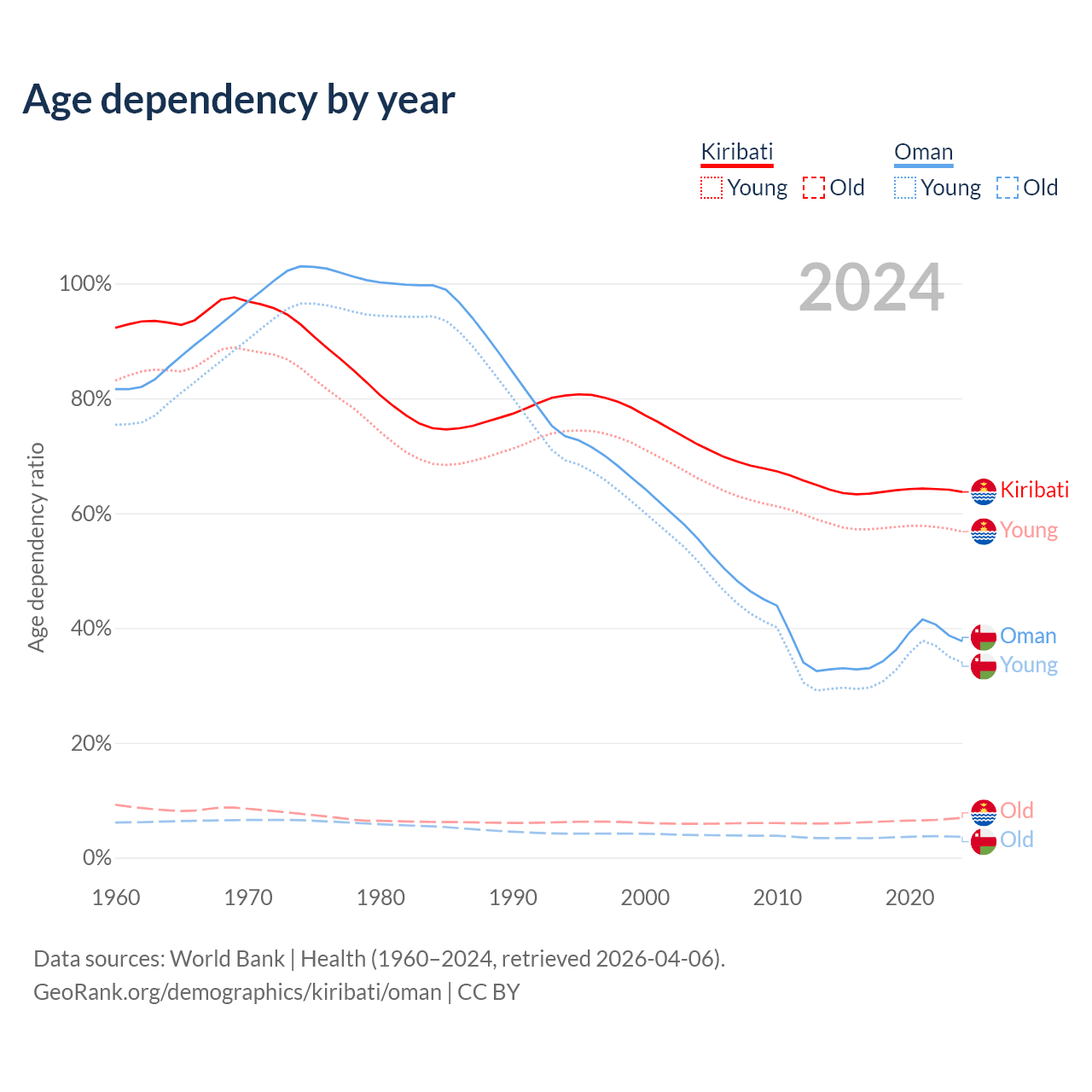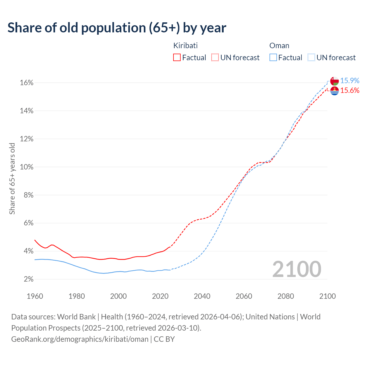 - The share of old-age demographic (65+) in Kiribati is 4.24% vs 2.64% in Oman.