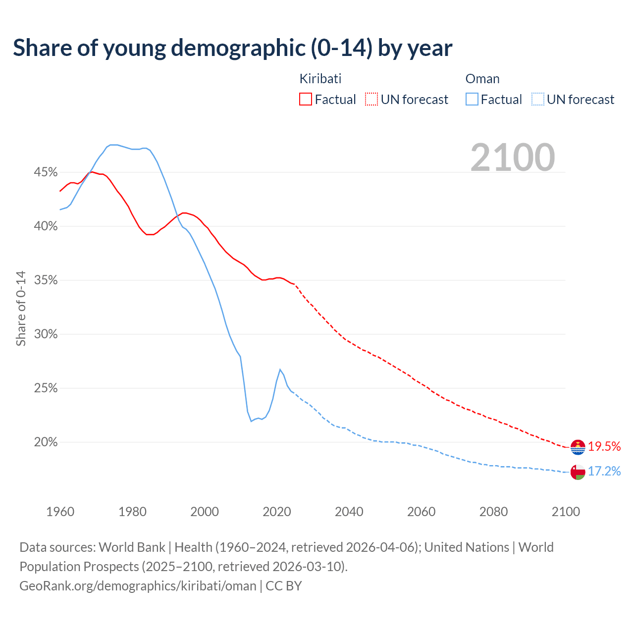 - The share of young demographic (0-15 years old) in Kiribati is 34.7% vs 24.7% in Oman.