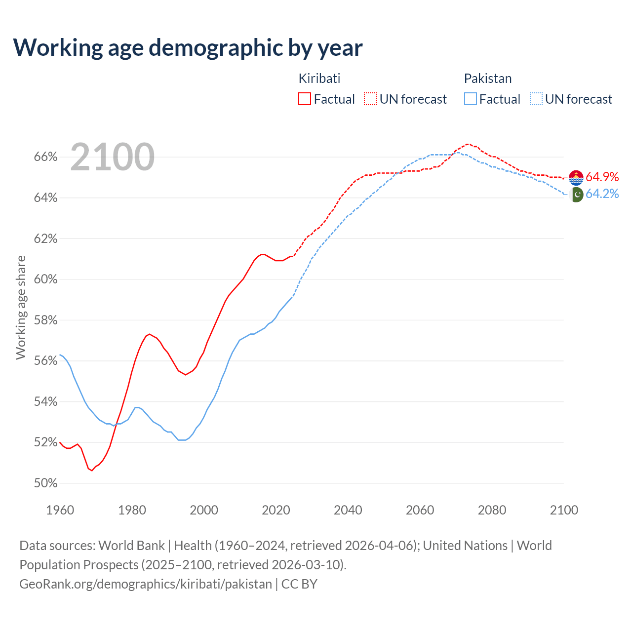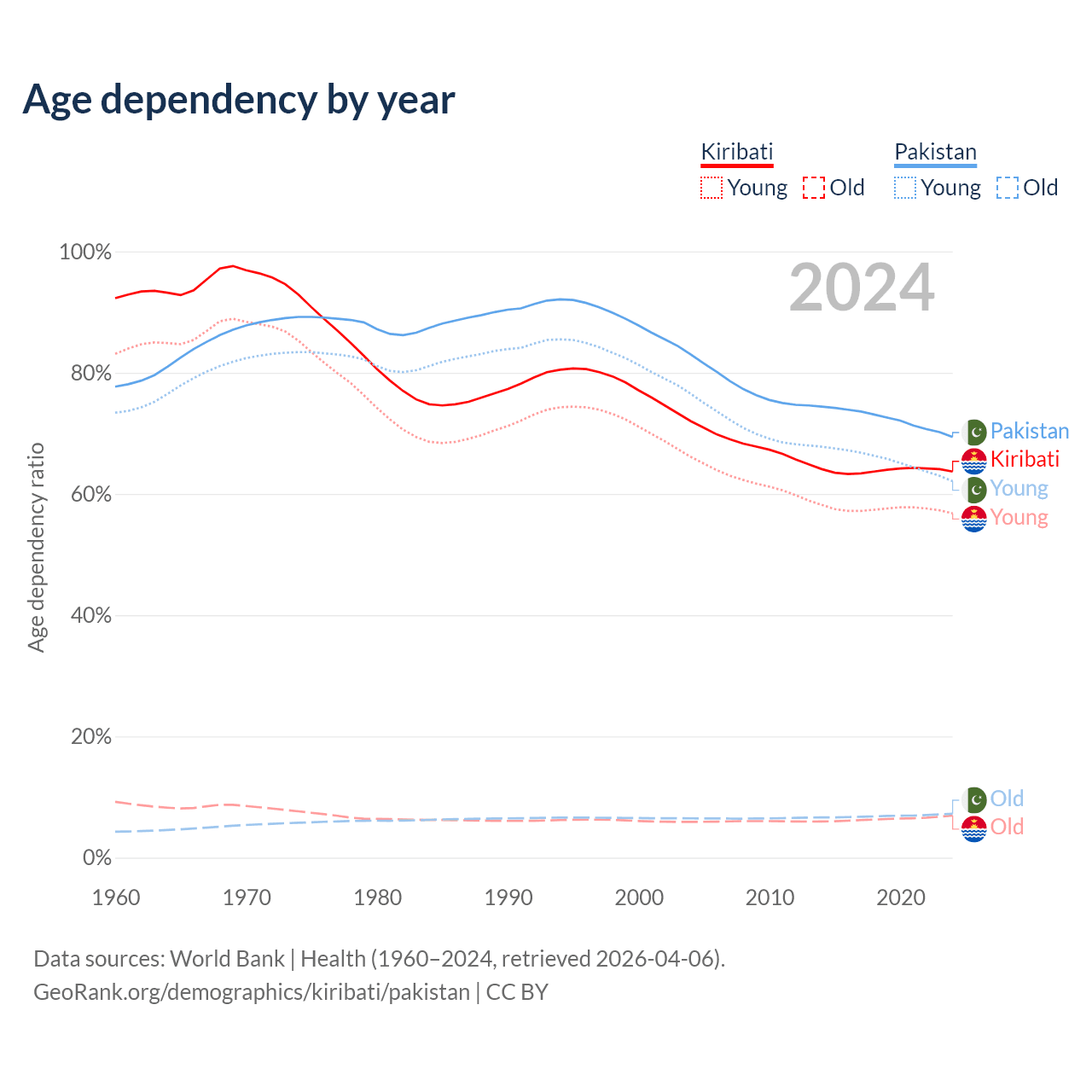 - The share of old-age demographic (65+) in Kiribati is 4.24% vs 4.28% in Pakistan.