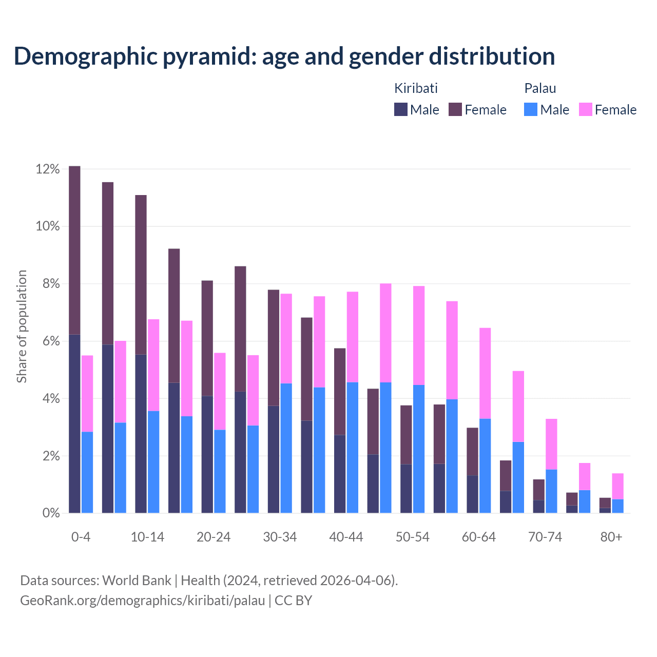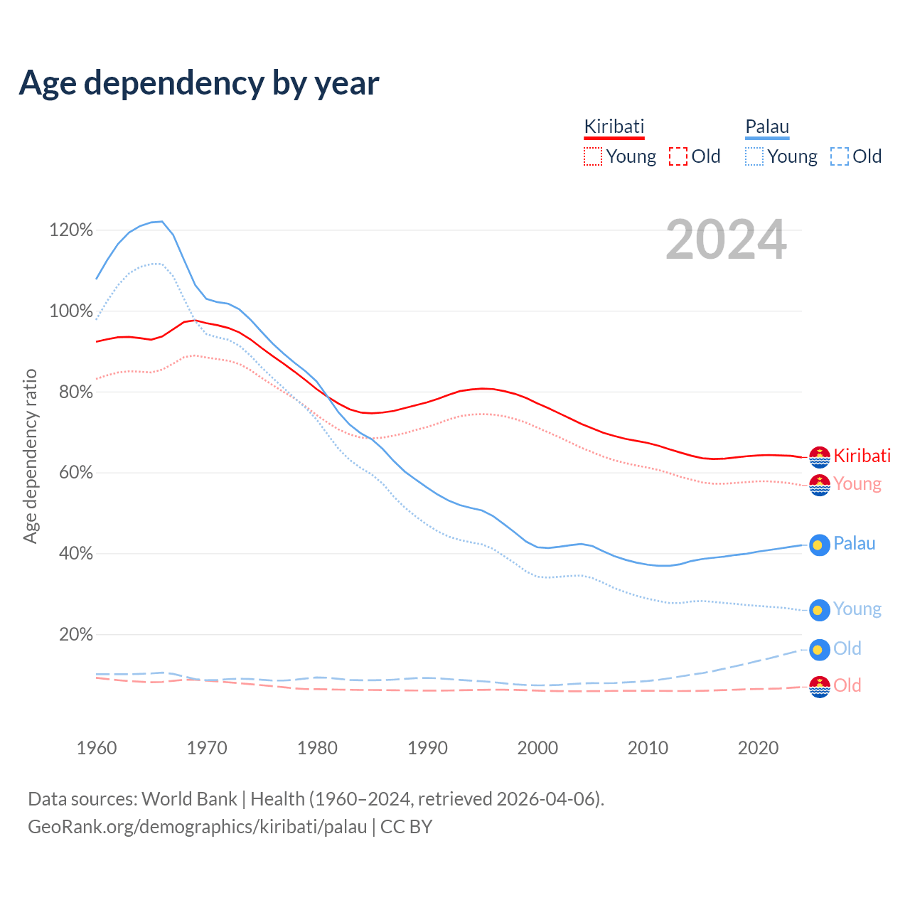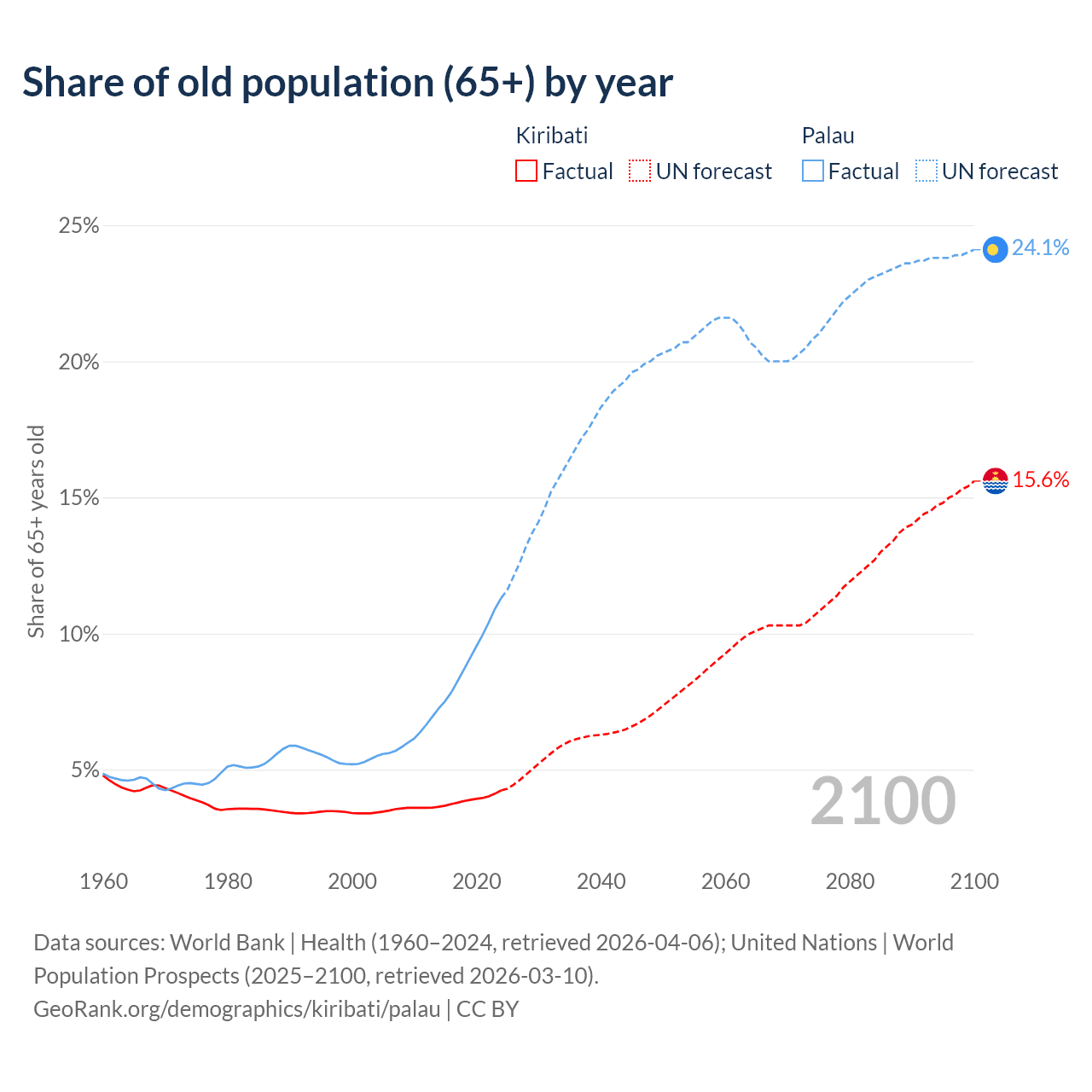 - The share of old-age demographic (65+) in Kiribati is 4.24% vs 11.3% in Palau.