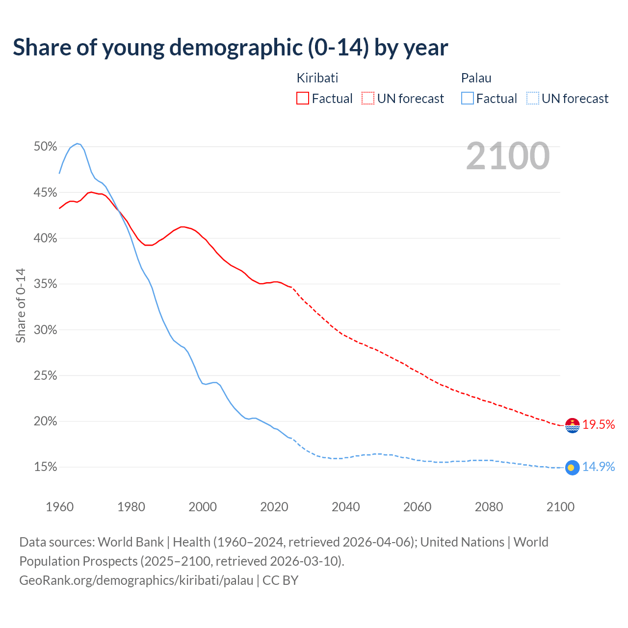 - The share of young demographic (0-15 years old) in Kiribati is 34.7% vs 18.2% in Palau.