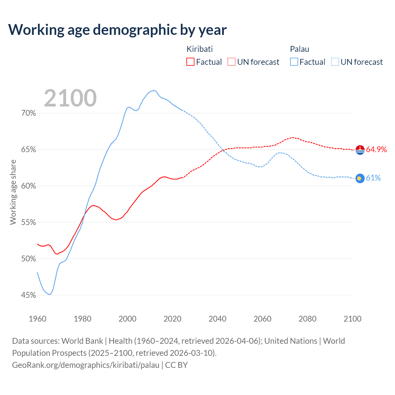 - Kiribati has 84.9K working age adults (aged 15-64) vs 12.4K in Palau.