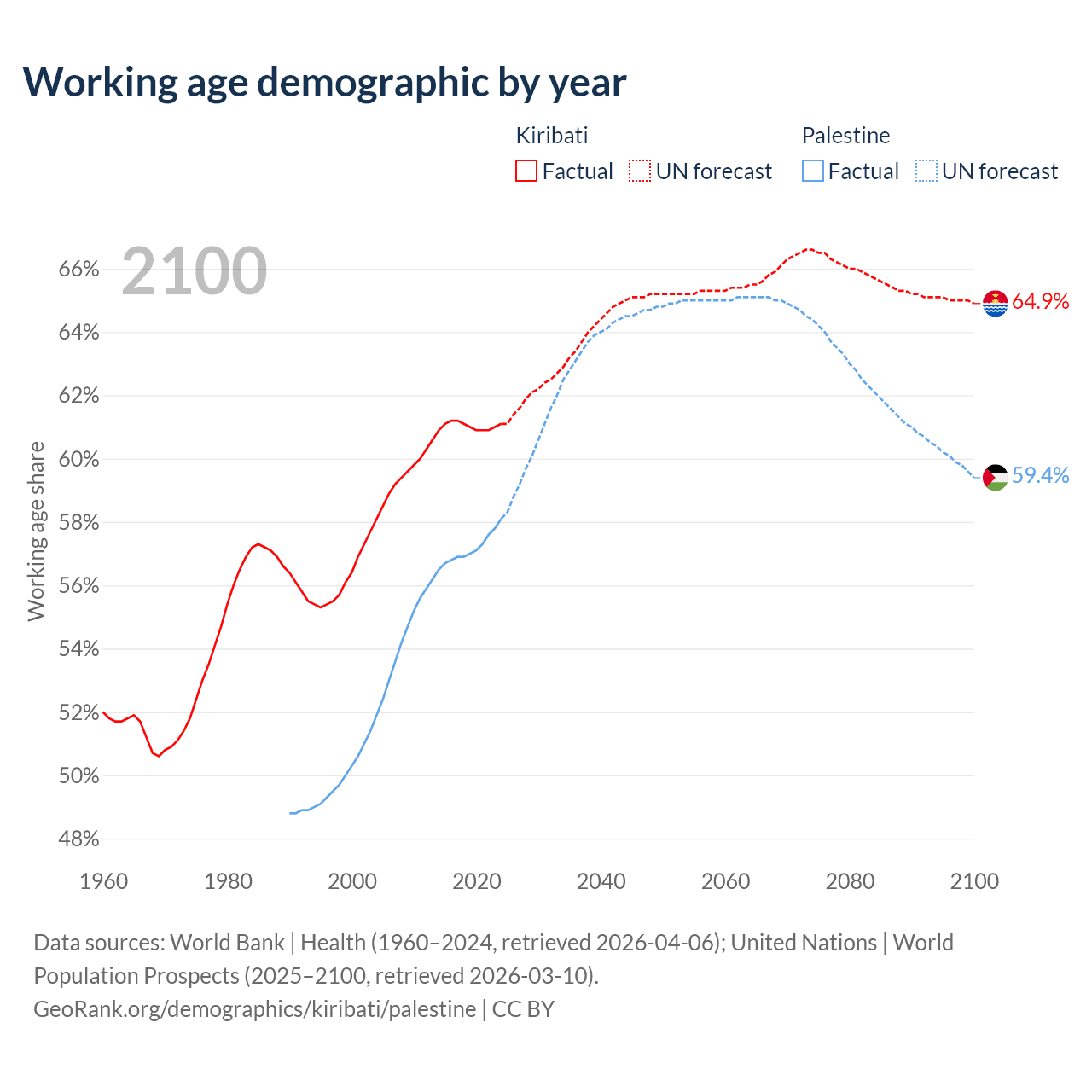 - Kiribati has 84.9K working age adults (aged 15-64) vs 3.2M in Palestine.