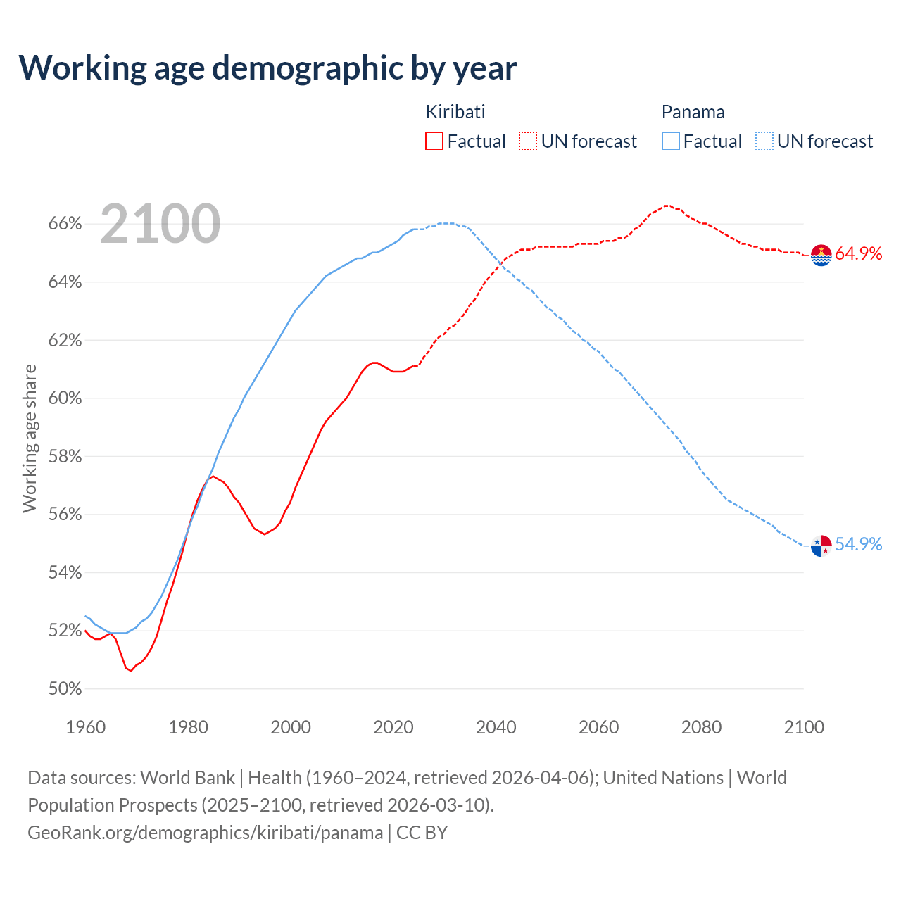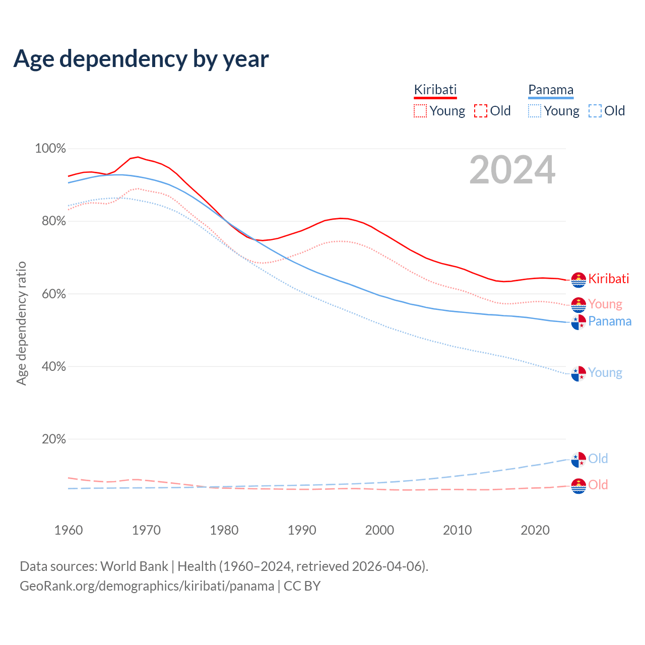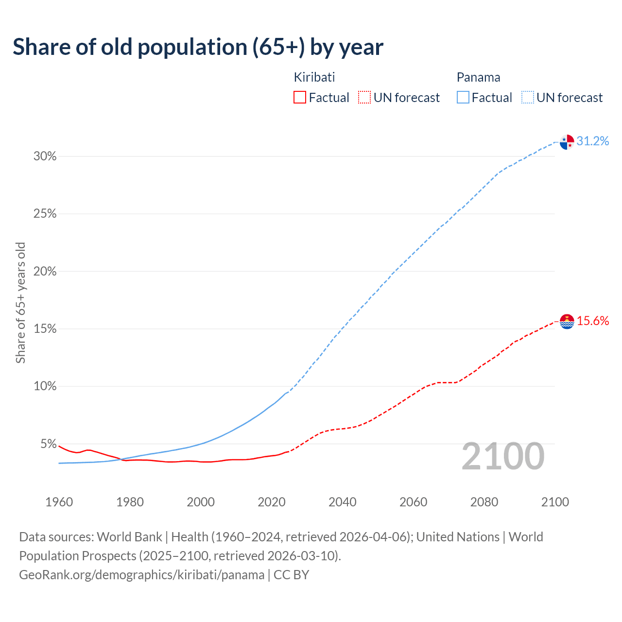 - The share of old-age demographic (65+) in Kiribati is 4.24% vs 9.35% in Panama.