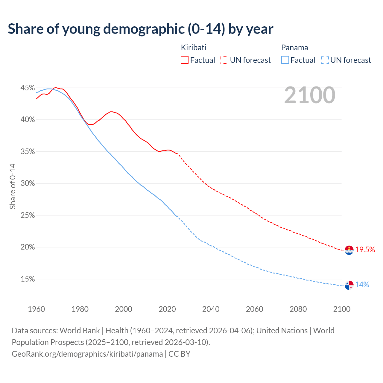 - The share of young demographic (0-15 years old) in Kiribati is 34.7% vs 24.9% in Panama.