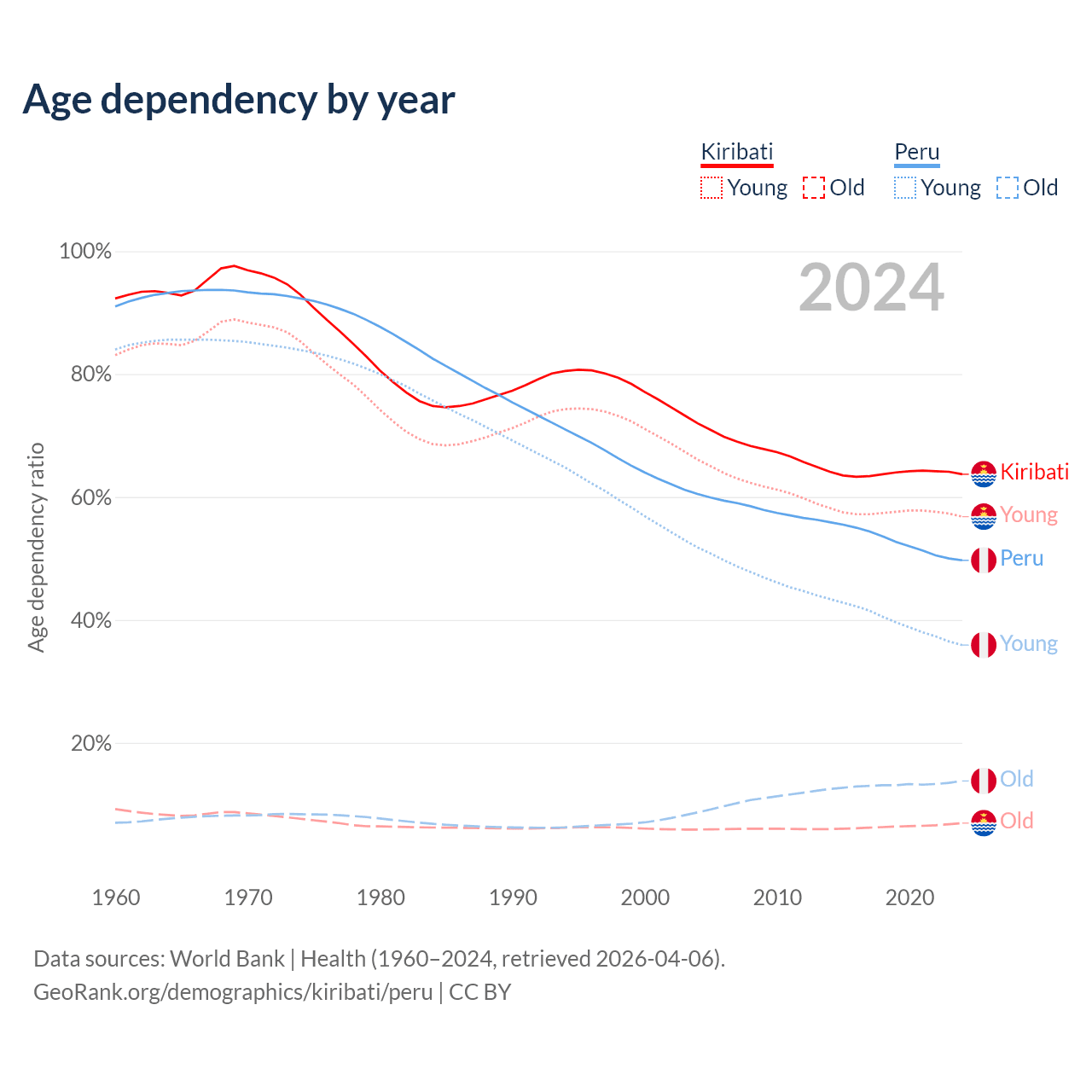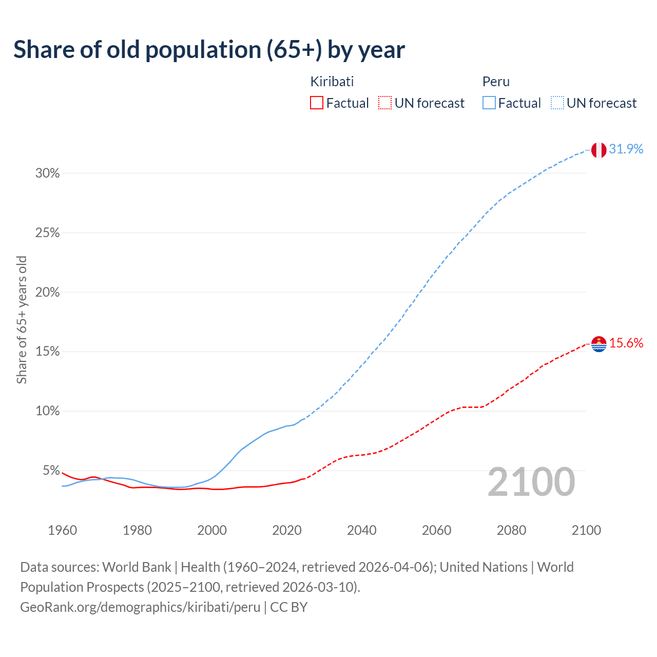 - The share of old-age demographic (65+) in Kiribati is 4.24% vs 9.23% in Peru.