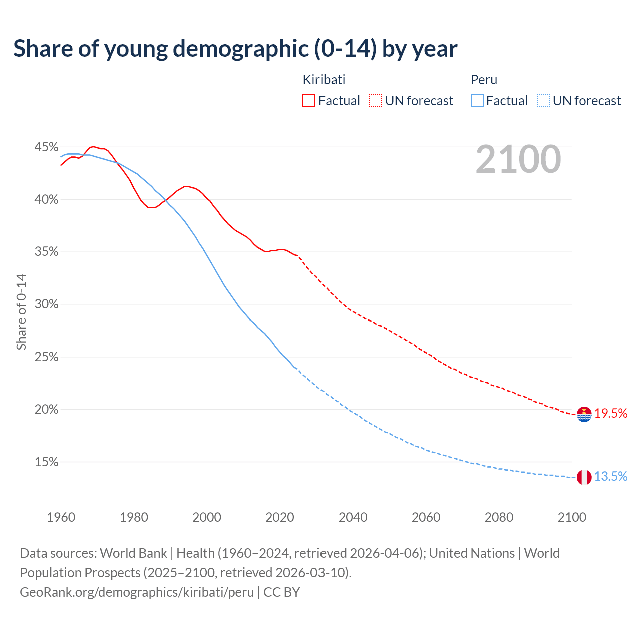 - The share of young demographic (0-15 years old) in Kiribati is 34.7% vs 24% in Peru.