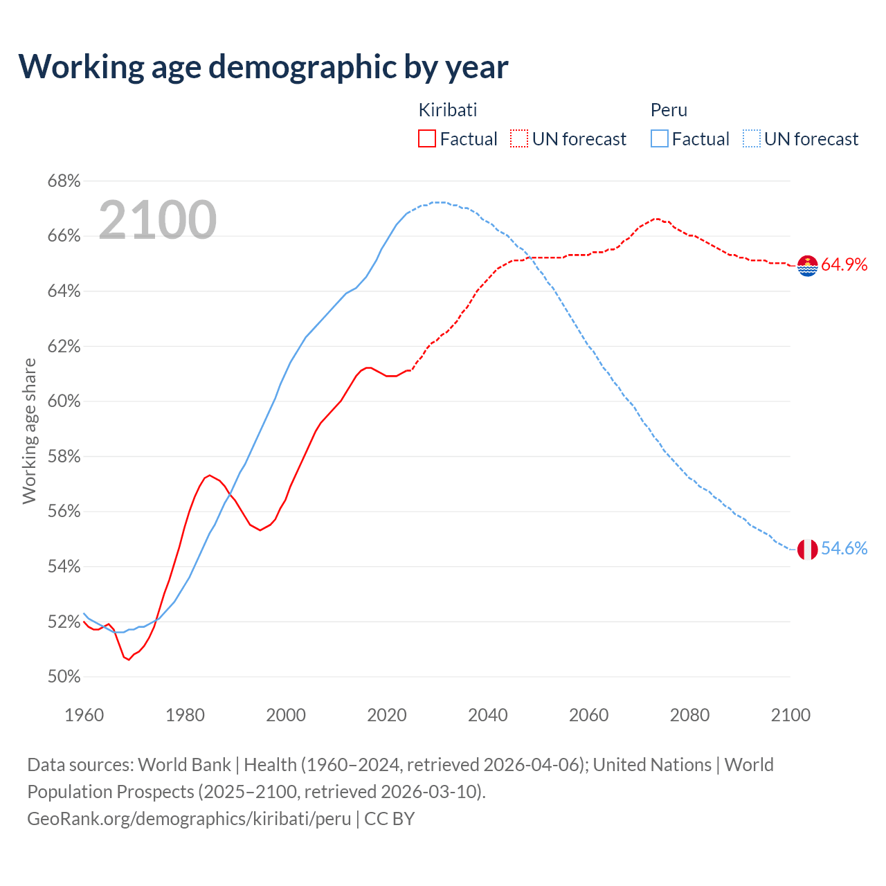Median age Kiribati vs Peru, 1960-2100