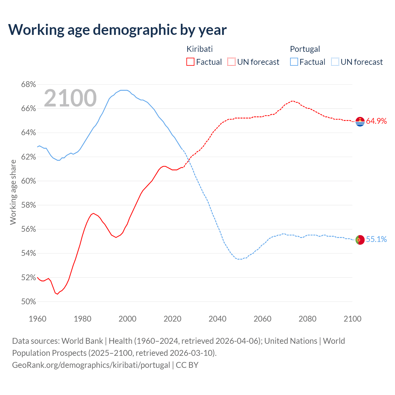 - Kiribati has 84.9K working age adults (aged 15-64) vs 6.68M in Portugal.