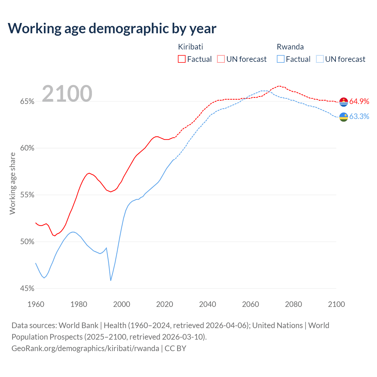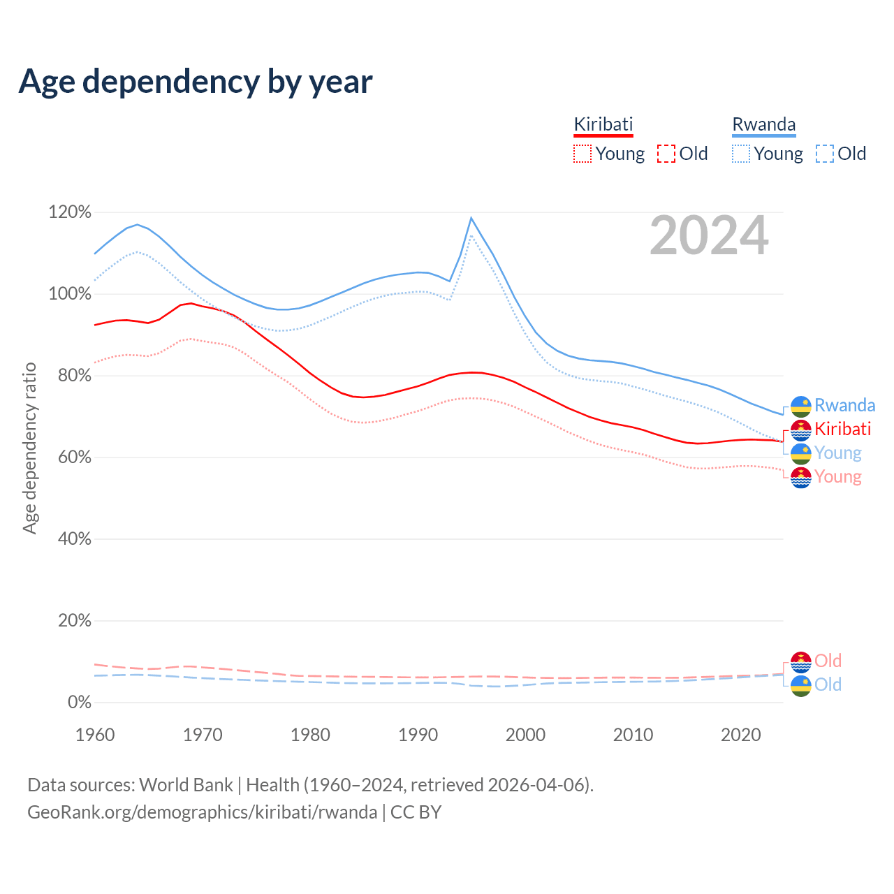 - The share of old-age demographic (65+) in Kiribati is 4.24% vs 3.93% in Rwanda.