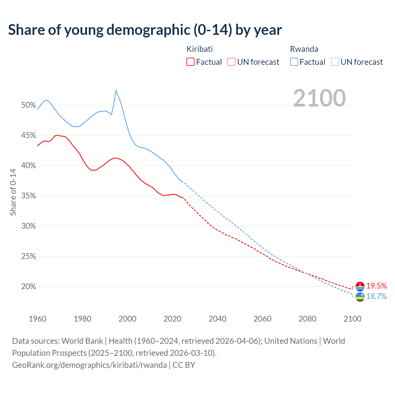 - The share of young demographic (0-15 years old) in Kiribati is 34.7% vs 37.4% in Rwanda.