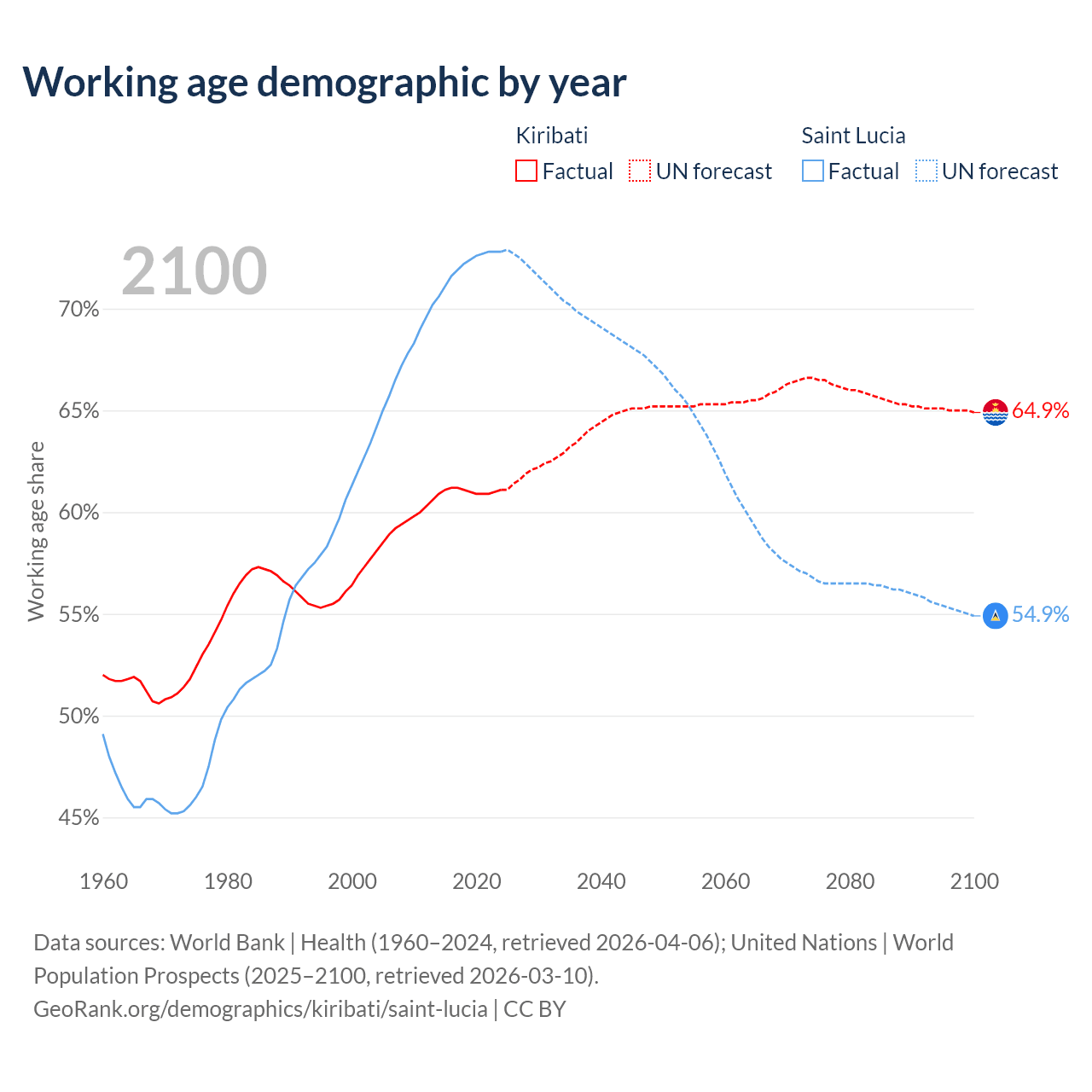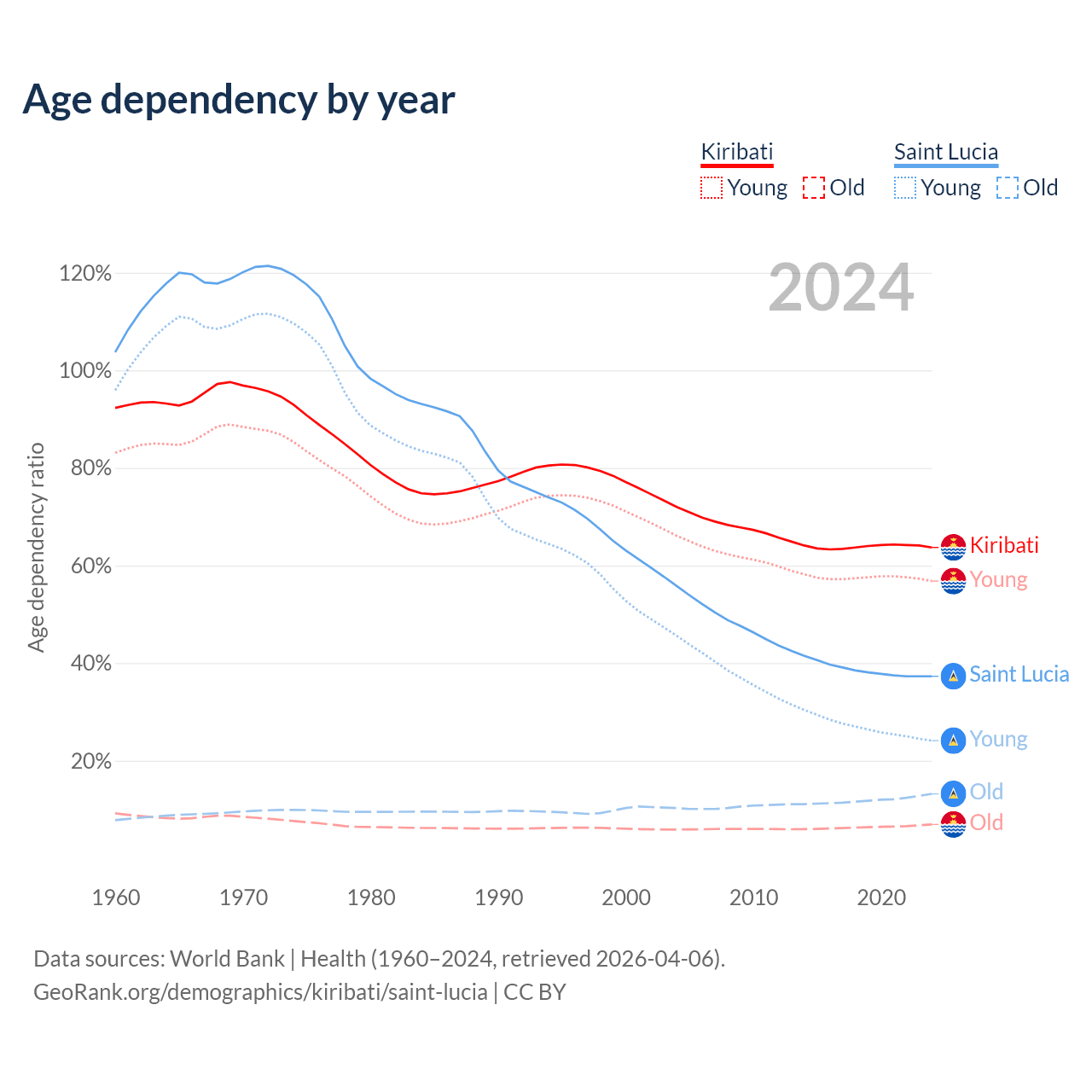 - The share of old-age demographic (65+) in Kiribati is 4.24% vs 9.62% in Saint Lucia.