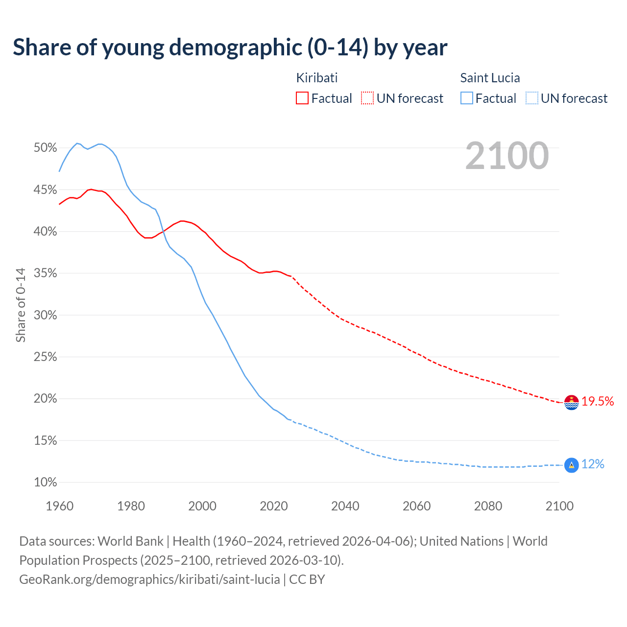 - The share of young demographic (0-15 years old) in Kiribati is 34.7% vs 17.5% in Saint Lucia.