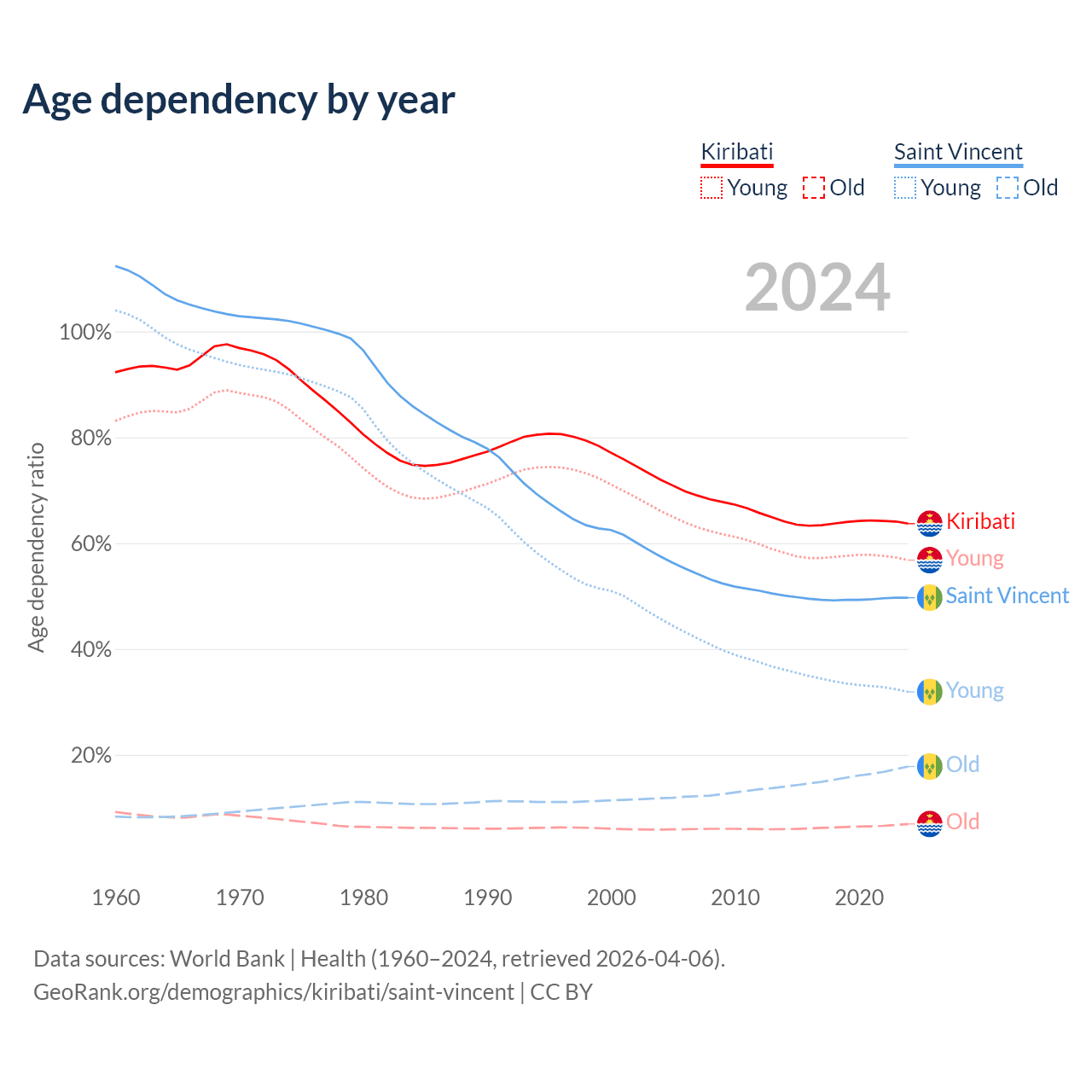- The share of old-age demographic (65+) in Kiribati is 4.24% vs 11.9% in Saint Vincent.