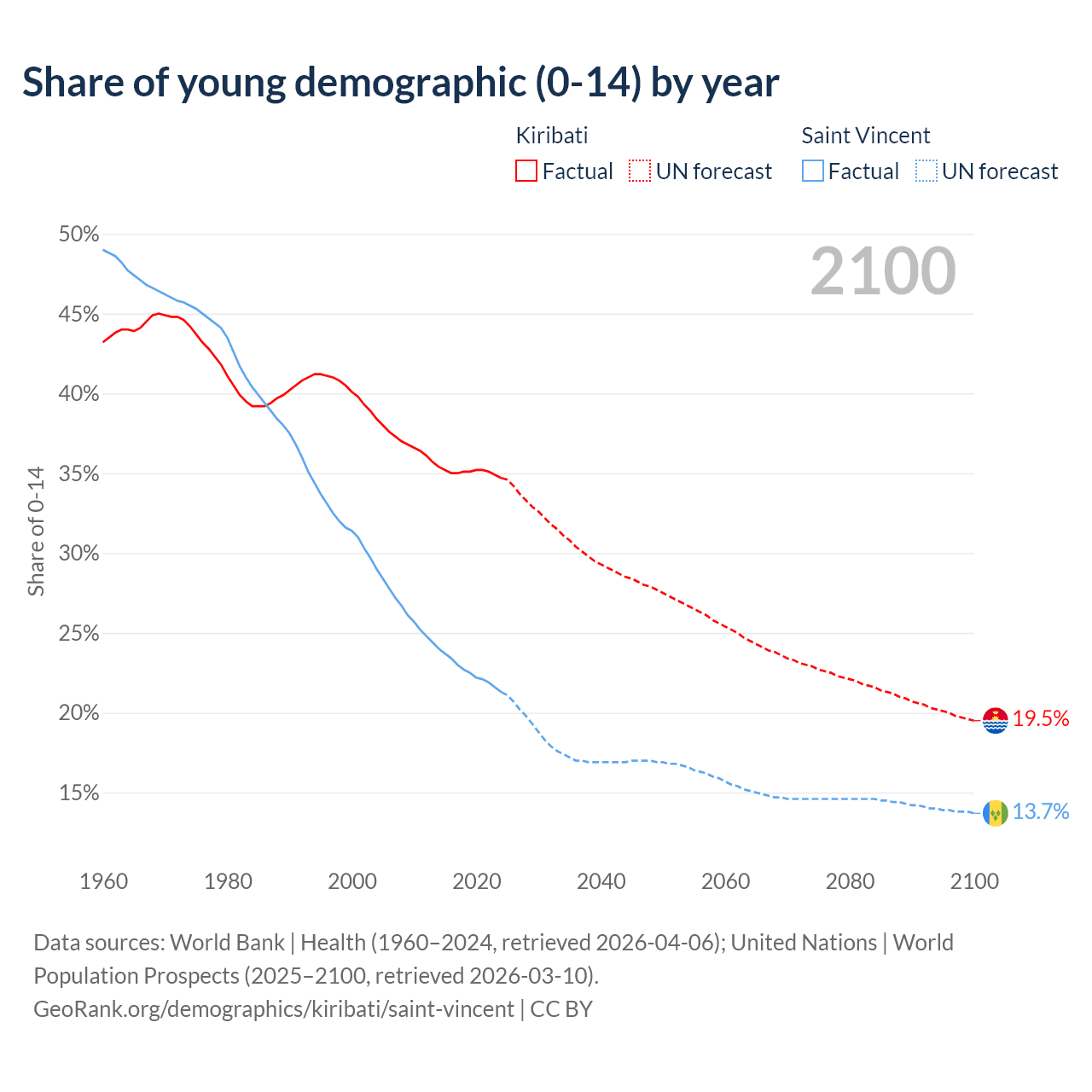 - The share of young demographic (0-15 years old) in Kiribati is 34.7% vs 21.3% in Saint Vincent.