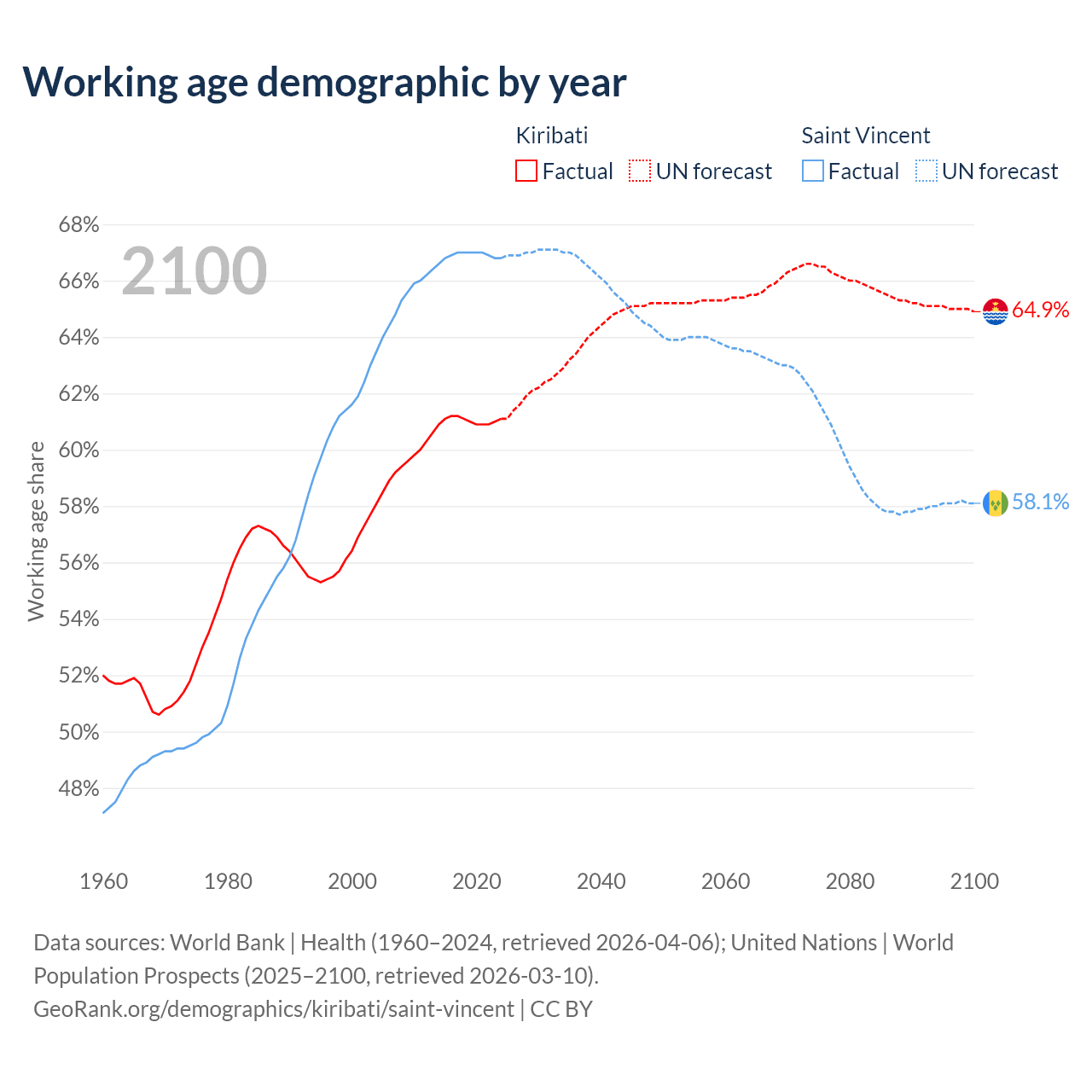 - Kiribati has 84.9K working age adults (aged 15-64) vs 66.3K in Saint Vincent.