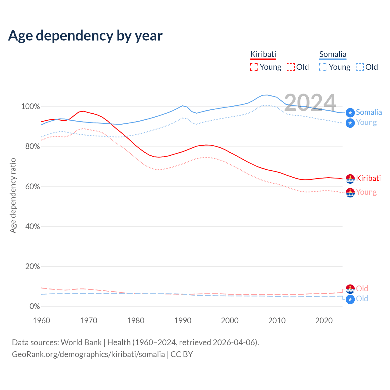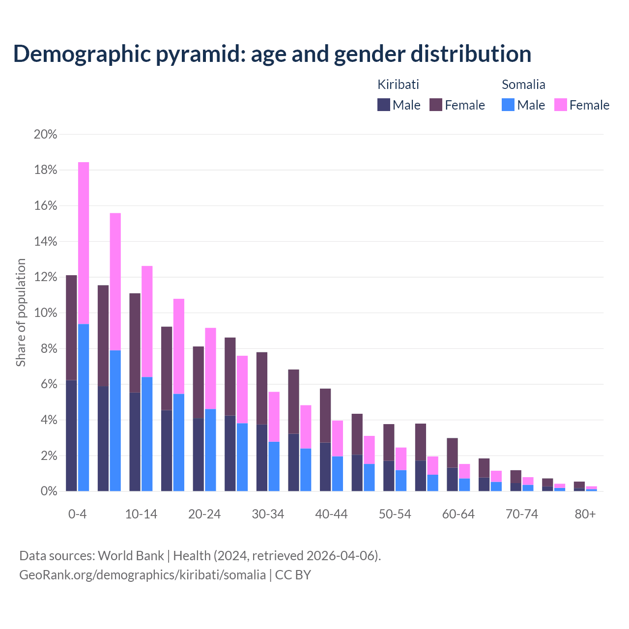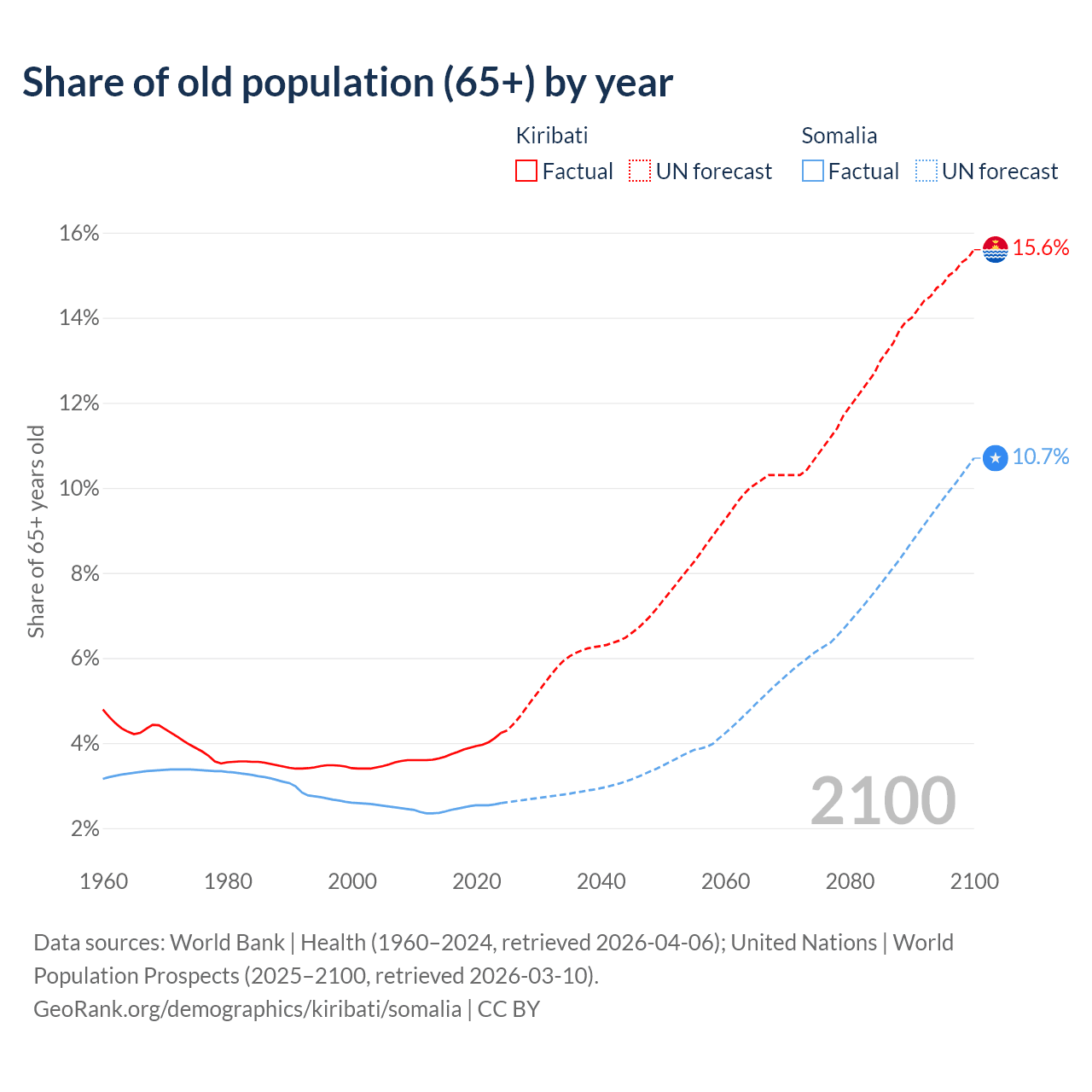 - The share of old-age demographic (65+) in Kiribati is 4.24% vs 2.59% in Somalia.