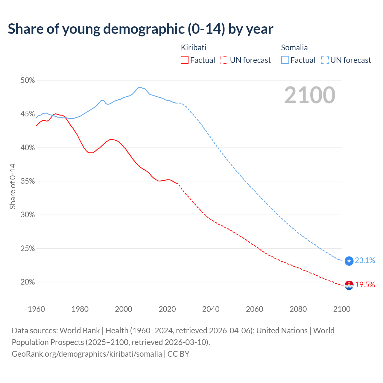 - The share of young demographic (0-15 years old) in Kiribati is 34.7% vs 46.6% in Somalia.