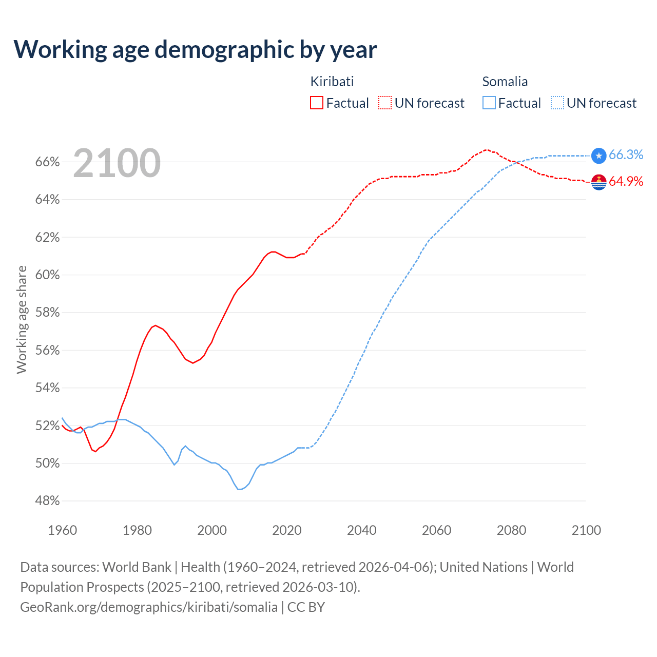 - Kiribati has 84.9K working age adults (aged 15-64) vs 10.4M in Somalia.