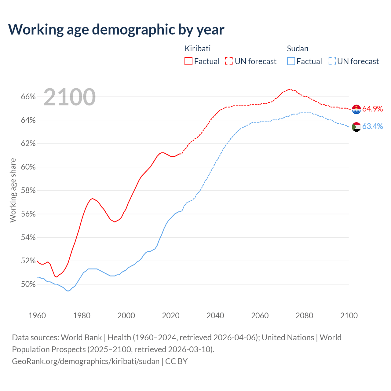 - The share of old-age demographic (65+) in Kiribati is 4.24% vs 3.3% in Sudan.