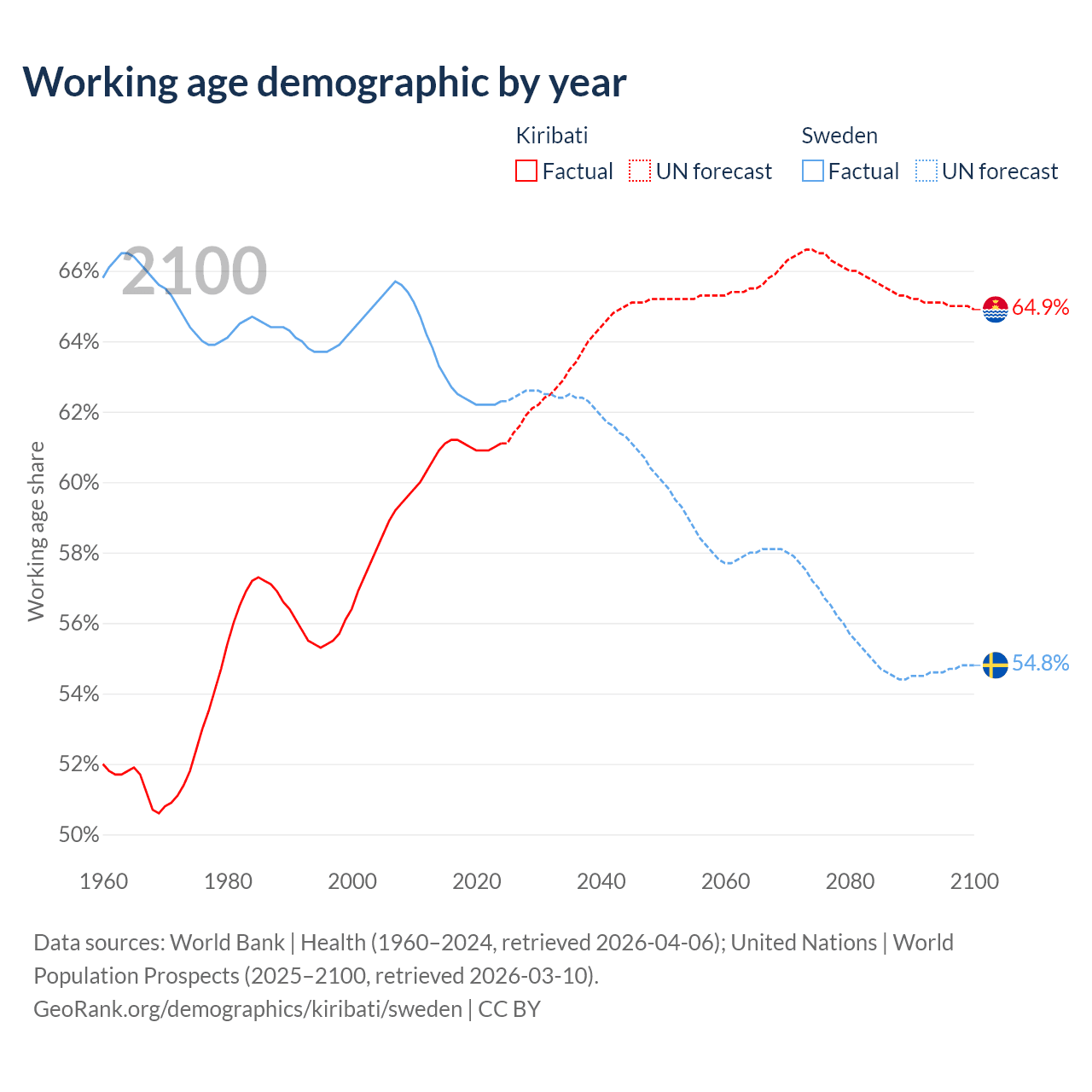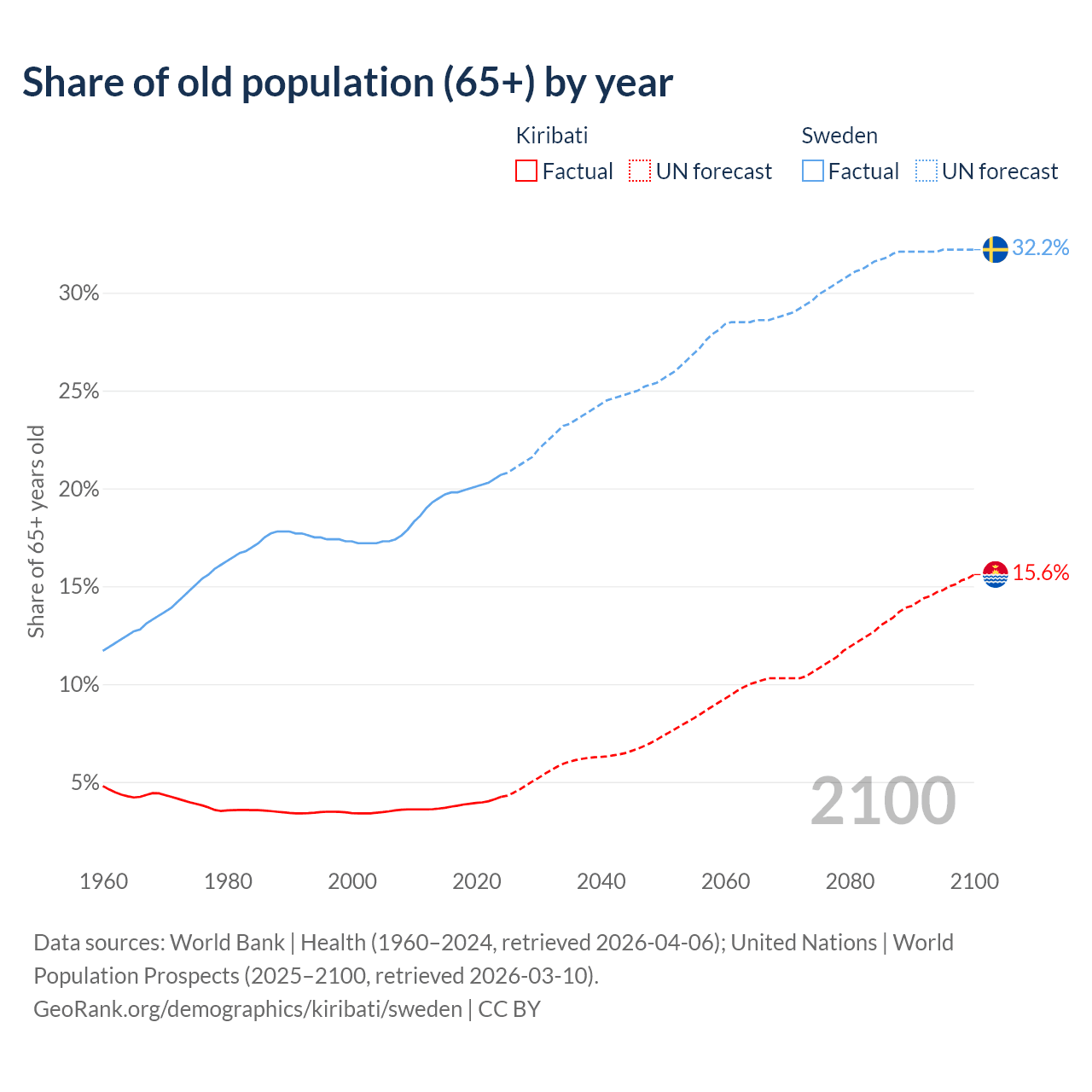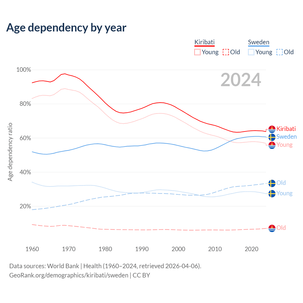 The share of older people aged 65 and over is 4.24% in Kiribati and 20.7% in Sweden. Life expectancy in Kiribati compared to Sweden .