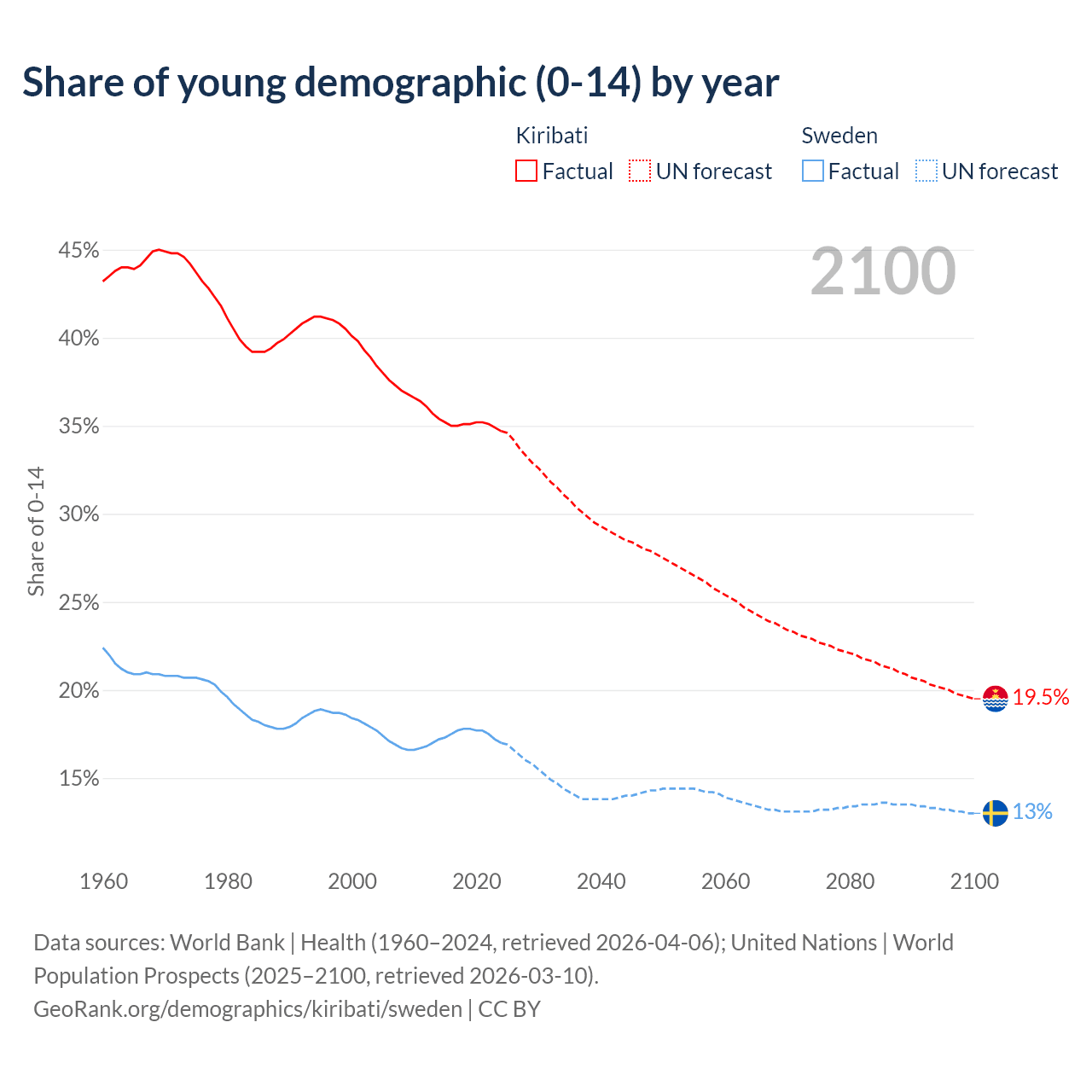- The share of young demographic (0-15 years old) in Kiribati is 34.7% vs 17% in Sweden.