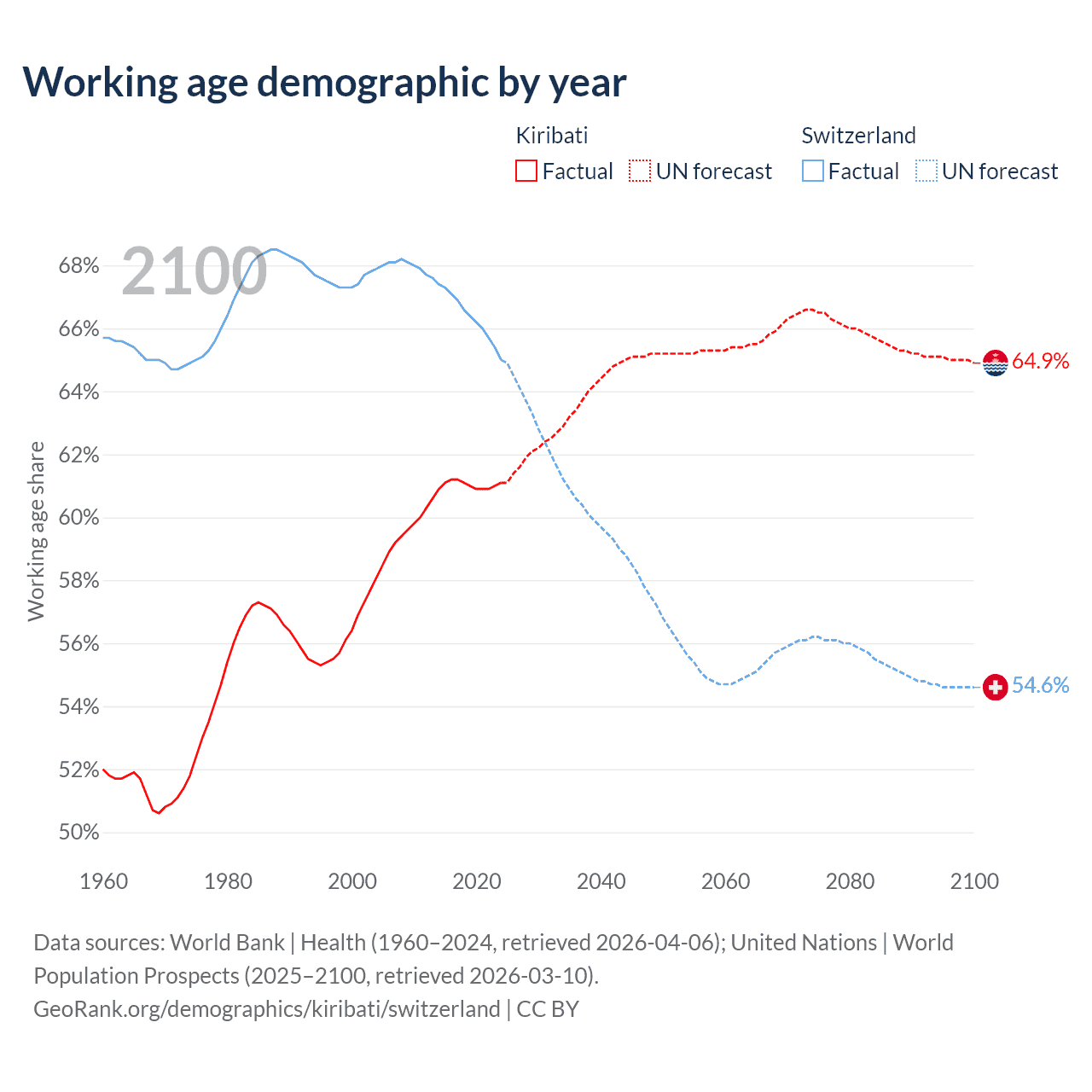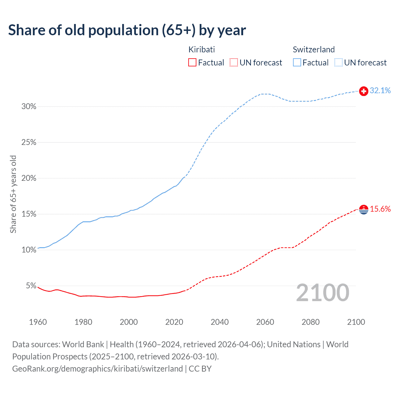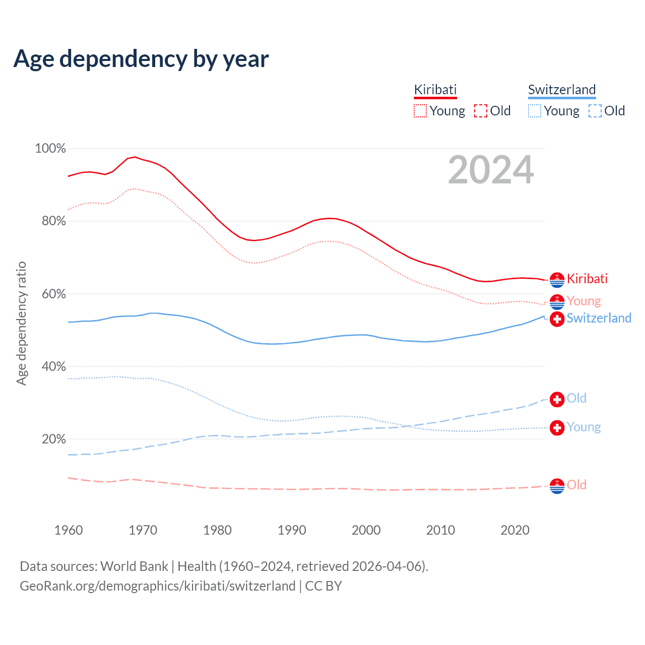 The share of older people aged 65 and over is 4.24% in Kiribati and 20% in Switzerland. Life expectancy in Kiribati compared to Switzerland .
