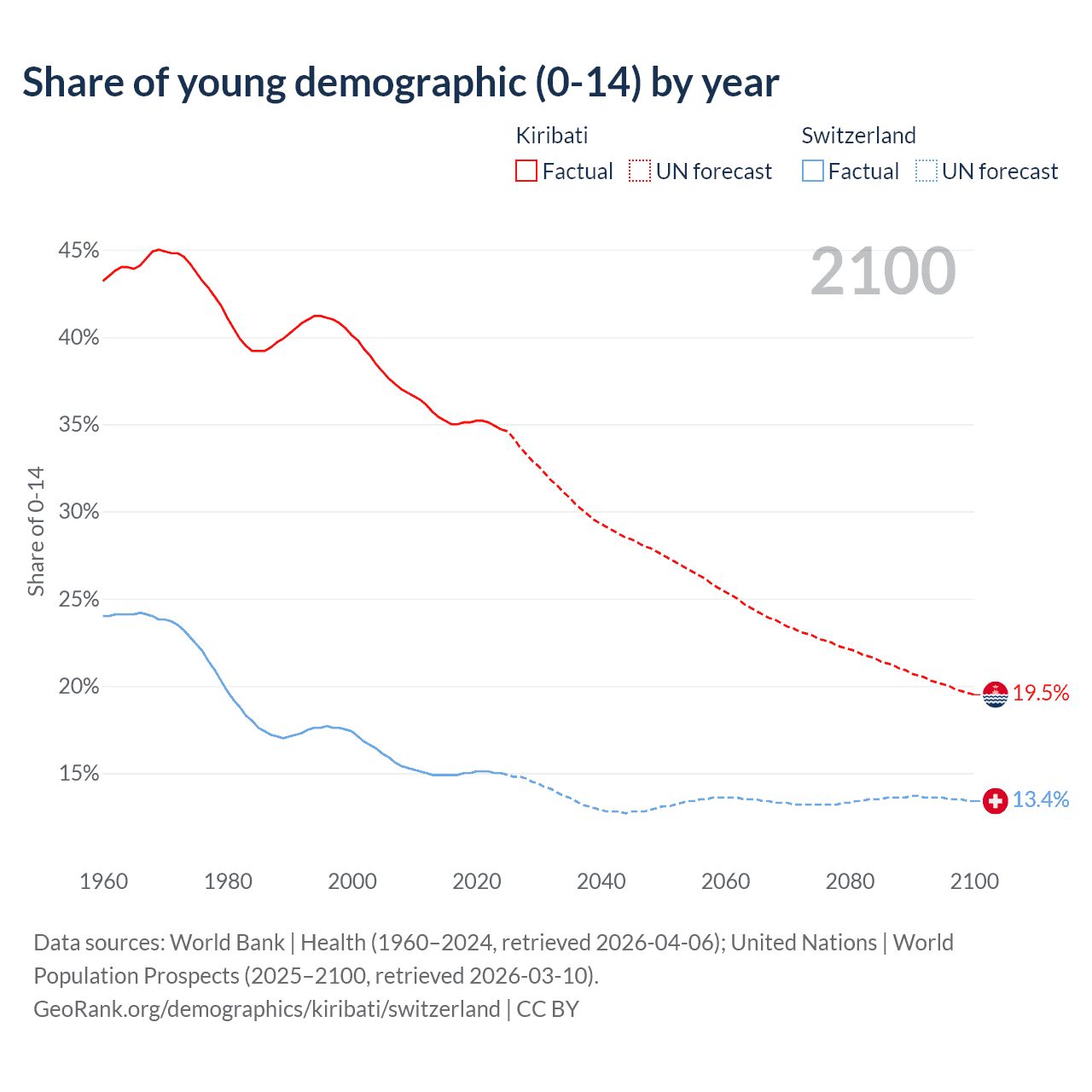 - The share of young demographic (0-15 years old) in Kiribati is 34.7% vs 15% in Switzerland.