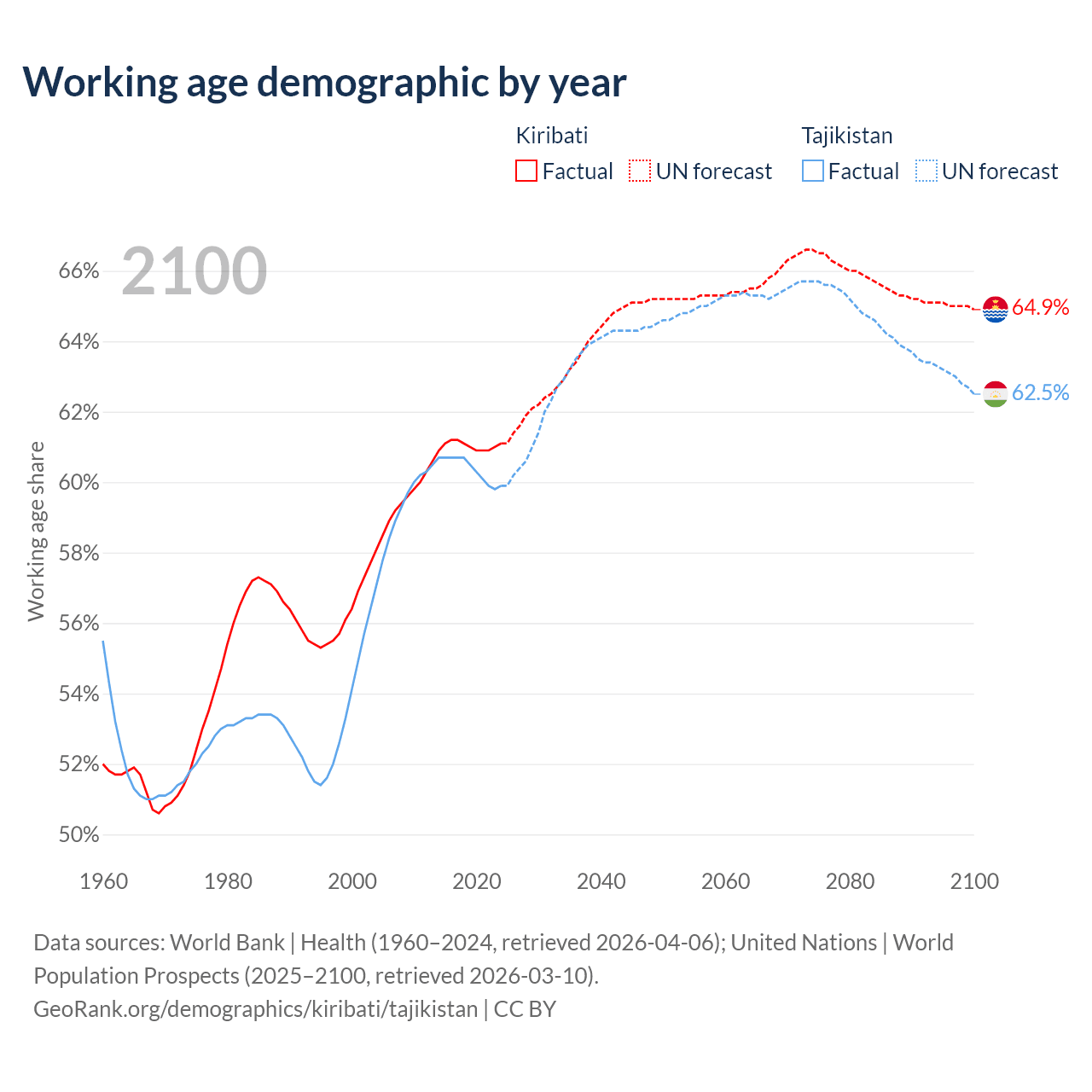 Median age Kiribati vs Tajikistan, 1960-2100