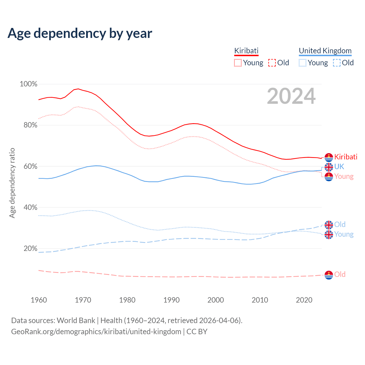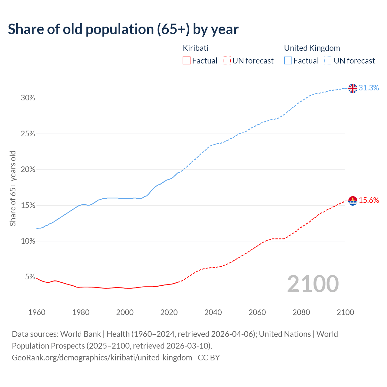 - The share of old-age demographic (65+) in Kiribati is 4.24% vs 19.5% in the United Kingdom.