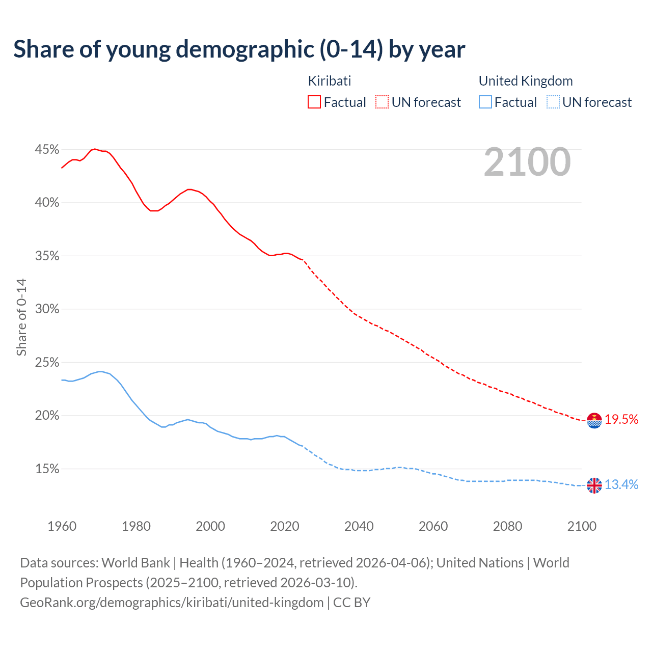 - The share of young demographic (0-15 years old) in Kiribati is 34.7% vs 17.2% in the United Kingdom.