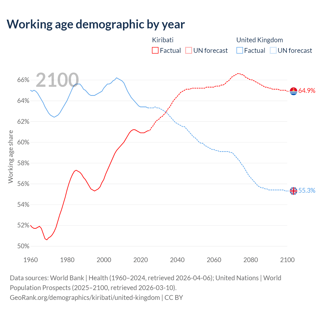 - Kiribati has 84.9K working age adults (aged 15-64) vs 44.4M in the United Kingdom.